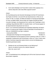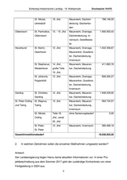 Drucksache 19/470 Schleswig-Holsteinischer Landtag - 19. Wahlperiode 3. Durch welche Beteiligten sind Finanzmittel in welcher Höhe zugesagt und zu welchen Zeitpunkten sollen diese Mittel ausgezahlt werden? Antwort: Der Haushaltsausschuss des Deutschen Bundestages hat Ende 2015 beschlossen, das Projekt mit 9,35 Mio. € und somit 50% des Gesamtvolumens in Höhe von sei- nerzeit 18,7 Mio. € zu fördern. Die Mittel sind etatisiert im Haushalt der Beauftragten für Kultur und Medien (BKM). Derzeit erfolgt nach Angaben des BKM die Abstim- mung aller Unterlagen, die antragsrelevant sind, zwischen dem Projektträger und der zuständigen Bauprüfbehörde GMSH. Ein aktueller Kosten- und Finanzierungsplan für die Gesamtmaßnahme liegt derzeit noch nicht vor. Der Ev.-Luth. Kirchenkreis Nordfriesland als Projektträger beabsichtigt, die Gesamt- kosten zur Umsetzung des Projektes „Erhalt der Eiderstedter Kirchenlandschaft“ in Höhe von 18.658.605,00 € wie folgt zu realisieren: - Zuschuss Bund (BKM): 9.329.302,50 € - Zweckgebundene Rücklagen der Kirchengemeinden 305.080,12 € Die noch bestehende Finanzierungslücke soll über Fundraising in Höhe von 1,5 Mio. € (angestrebt), Kreditaufnahme des Kirchenkreises in Höhe von 7,5 Mio. € (sofern keine weiteren Zuschüsse eingeworben werden können) und durch die Beteiligung der Nordkirche geschlossen werden. 4. Beteiligt sich das Land Schleswig-Holstein an den Maßnahmen? Wenn ja, mit welcher Summe und zu welchem Zeitpunkt? Wenn nein, warum nicht? Antwort: Nein. Im Haushaltsentwurf der Landesregierung für 2018 ist kein Zuschuss für dieses Bauvorhaben vorgesehen. 4