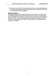 Drucksache 18/73 Schleswig-Holsteinischer Landtag - 18. Wahlperiode Wenn ja, unter welchen Voraussetzungen? Antwort zu Frage 3: Das Land gewährt den Gemeinden, Kreisen und Ämtern nach dem Finanzaus- gleichsgesetz allgemeine Finanzzuweisungen sowie Zweckzuweisungen (§ 2 Abs. 1, 2 FAG). Über die Verwendung allgemeiner Finanzzuweisungen entscheiden die Empfän- ger im Rahmen der gesetzlichen Vorschriften. Zu den Zweckzuweisungen im Finanzausgleichsgesetz zählen die Zuweisungen für Theater und Orchester. Hierbei handelt es sich jedoch um Zuweisungen zu den Betriebskosten oder zu den Finanzierungsanteilen an den Betriebskosten der Theater und Orchester (§ 21 Abs. 1 FAG). Für den Bereich der Sonderbedarfszuweisungen ist die Prüfung bereits abge- schlossen. Gemäß § 17 i. V. m. § 7 FAG stehen jährlich 5,0 Mio. € für Sonderbe- darfszuweisungen zur Verfügung (davon 0,5 Mio. € für die modellhafte Erprobung neuer Formen der Verwaltungsorganisation). Die Sonderbedarfszuweisungen sind als Förderinstrument hier ungeeignet. Gefördert werden sollen vorrangig kleinere Gemeinden, zu denen die Stadt Schleswig nicht zählt. Weitere Voraussetzung ist, dass die Gemeinde alle eige- nen Finanzierungsmöglichkeiten ausgeschöpft hat. Zudem stehen bei den Son- derbedarfszuweisungen keine Verpflichtungsermächtigungen zur Verfügung, so dass überjährige Finanzzusagen nicht getroffen werden können. Im Übrigen wird auf die Antwort auf die Kleine Anfrage Drs. 17/2078 vom 22.12.2011, Frage Nr. 3., verwiesen. 4. In welcher Weise hat die Landesregierung die Stadt Schleswig und die Lan- destheater-GmbH unterstützend beraten? Antwort zu Frage 4: In den vergangenen Wochen haben immer wieder Gespräche zwischen Mitglie- dern der Landesregierung, Landtagsabgeordneten und Schleswiger Kommunal- politikern stattgefunden, in denen es um die Problematik der Schließung des Theaters und den gewünschten Theaterneubau ging. Kulturministerin Anke Spoorendonk hat zuletzt mit Schreiben vom 11.07.2012 an den Schleswiger Bürgermeister Thorsten Dahl und an den Aufsichtsratsvorsit- zenden der Landestheater GmbH, Landrat Dr. Jörn Klimant, mitgeteilt, dass sich die Landesregierung um eine sachgerechte Lösung bemühen wird. Am 24. Juli 2012 hat bei Innenminister Andreas Breitner ein Beratungsgespräch zur Förderung aus Sonderbedarfszuweisungen stattgefunden. Teilgenommen haben Herr Bürgermeister Dahl, Frau Dr. Pfannkuch (Leiterin des Fachbereichs Bürgerservice der Stadt Schleswig), Herr Sachau (Leiter des Fachbereichs Zent- raler Service) und Herr Stoltenberg (Leiter Fachdienst Finanzen). 2