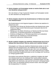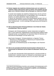 Schleswig-Holsteinischer Landtag - 19. Wahlperiode Drucksache 19/1756 15. Welche Aufgaben und Fachaufgaben werden an welcher Stelle oder an wel- chen Standorten wahrgenommen? Die in der Antwort zu Frage 14 genannten Aufgaben und Fachaufgaben werden von allen Standorten aus wahrgenommen. 16. Welche Aufgaben übernimmt das Sozialministerium im Rahmen des staatli- chen Arbeitsschutzes? Das Sozialministerium nimmt folgende Aufgaben im Rahmen des staatlichen Ar- beitsschutzes wahr: • Sicherstellen des Vollzugs der Rechtsvorschriften des Arbeitsschutzes (siehe Antwort zu Frage 13) durch Wahrnehmung der Fachaufsicht über die Voll- zugsbehörde StAUK • Beteiligung an der (Weiter-)Entwicklung von Rechtsvorschriften des Arbeits- schutzes bzw. an Rechtsetzungsverfahren auf Bundesebene • Einleitung und Begleitung von Rechtsetzungsverfahren auf Landesebene • Mitwirkung bei der Feststellung von Berufskrankheiten • Vollzug des medizinischen Arbeitsschutzes 17. Werden zusätzlich Aufgaben des staatlichen Arbeitsschutzes durch die Un- fallkasse Nord übernommen? Wenn ja, welche und in welchem Umfang? Fachaufgaben zum Vollzug des staatlichen Arbeitsschutzes werden von der Un- fallkasse Nord nicht wahrgenommen. Die Unfallkasse Nord nimmt diejenigen Aufgaben für den staatlichen Arbeitsschutz wahr, die ihr vom Land Schleswig- Holstein per Gesetz übertragen wurden und für deren Wahrnehmung ihr entspre- chende Landesmittel (Ausgleichszahlungen) auf der Grundlage einer Verordnung zur Verfügung gestellt werden. Eine darüber hinaus gehende Übernahme „zusätzliche(r) Aufgaben des staatli- chen Arbeitsschutzes durch die Unfallkasse Nord“ würde praktisch bedeuten, dass Aufgaben des staatlichen Arbeitsschutzes in Schleswig-Holstein durch Bei- tragsmittel der dort Versicherten, also auch der Kommunen in Schleswig-Holstein und der Freien und Hansestadt Hamburg finanziert würden. Dies würde gegen das Sozialgesetzbuch IV verstoßen.