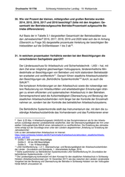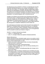 Drucksache 19/1756 Schleswig-Holsteinischer Landtag - 19. Wahlperiode 30. Wie viel Prozent der kleinen, mittelgroßen und großen Betriebe wurden 2014, 2015, 2016, 2017 und 2018 besichtigt? (bitte mit den Angaben: Ge- samtzahl der Betriebe/aufgesuchte Betriebe/Prozentzahl aufgesuchte Be- triebe differenzieren) Auf Basis der in Tabelle 3.1 dargestellten Gesamtzahl der Betriebsstätten aus 9 den Jahresberichten 2016, 2017, 2018, 2019 und 2020 leitet sich die im Anhang (Übersicht zu Frage 30) dargestellte prozentuale Verteilung der besichtigten Be- triebsstätten auf die Größenklassen 1 bis 3 ab . 10 31. In welchem prozentualen Verhältnis werden bei den Besichtigungen die verschiedenen Sachgebiete geprüft? Der Länderausschuss für Arbeitsschutz und Sicherheitstechnik - LASI – hat, mit dem Ziel einer möglichst gleichwertigen Vollzugspraxis, ländereinheitliche Min- destinhalte an Besichtigungen von Betrieben und nicht stationären Betriebsstät- 11 ten erarbeitet und veröffentlicht . Danach führen staatliche Arbeitsschutzbehör- 12 den Besichtigungen als „Behördliche Systemkontrolle“ durch; so auch die StAUK . 13 Die komplexen Anforderungen an den Arbeitsschutz sowie die notwendige wei- tere Reduzierung von Arbeitsunfällen und arbeitsbedingten Erkrankungen drän- gen zu einem effizienten und systematischen Arbeitsschutz in den Betrieben. Dementsprechend setzt die Aufsichtstätigkeit (Überwachung und Beratung) der staatlichen Arbeitsschutzbehörden nicht länger bei der Kontrolle der Einzelmaß- nahmen an, sondern bei der Kontrolle des betrieblichen Arbeitsschutzsystems. Die Behördliche Systemkontrolle stellt das Instrumentarium dar, mit dem die zu- ständige Arbeitsschutzbehörde das Vorhandensein und das Funktionieren einer 9 Gem. § 23 Abs. 4 Arbeitsschutzgesetz (ArbSchG) ist das Sozialministerium als für den Arbeits- schutz zuständige oberste Landesbehörde verpflichtet, über die Überwachungstätigkeit der ihm unter- stellten Vollzugsbehörde StAUK einen Jahresbericht zu veröffentlichen. Die Erstellung des Jahresbe- richts erfolgt auf der Grundlage einer unter den Ländern abgestimmten „Anleitung zur Erstattung der Jahresberichte“. Link zu den Jahresberichten Arbeitsschutz im Internet: https://www.schleswig-holstein.de/DE/Fachinhalte/A/arbeitsschutz/akkordeon_staatlicherArbeits- schutz_pdf.html 10 Größe 1: 500 und mehr Beschäftigte Größe 2: 20 bis 499 Beschäftigte Größe 3: 1 bis 19 Beschäftigte 11 LASI-Veröffentlichung – LV 1, Überwachungs- und Beratungstätigkeit der Arbeitsschutzbehörden der Länder - Grundsätze und Standards, 1. überarbeitete Auflage, 2016. 12 Siehe ausführlicher zur Behördlichen Systemkontrolle LASI-Veröffentlichung 54 „Grundsätze der behördlichen Systemkontrolle – LV 54“. 13 Die Landesregierung konkretisiert mit dem Konzept für den staatlichen Arbeitsschutz in Schleswig- Holstein (Arbeitsschutzkonzept vom 19. Dezember 2017) wie das zwischen den Ländern verabredete Vorgehen bei der Beratung und Überwachung der Betriebe in Schleswig-Holstein von der Vollzugsbe- hörde StAUK umzusetzen ist.
