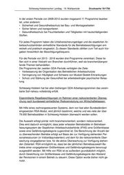 Schleswig-Holsteinischer Landtag - 19. Wahlperiode Drucksache 19/1756 In der ersten Periode von 2008-2012 wurden insgesamt 11 Programme bearbei- tet, unter anderem: • Sicherheit und Gesundheitsschutz bei Bau- und Montagearbeiten • Sicher fahren und transportieren • Gesundheitsschutz bei Feuchtarbeiten und Tätigkeiten mit hautschädigenden Stoffen. Für jedes Programm haben die Unfallversicherungsträger und die staatlichen Ar- beitsschutzbehörden einheitliche Standards für die Betriebsbesichtigungen ent- wickelt und praktisch eingesetzt. Zu diesen Standards zählten zum Teil auch Vor- gaben hinsichtlich der Besichtigungsfrequenz. Für die Periode von 2013 - 2018 wurden drei Programme vereinbart. Diese lie- ßen sich in einer Vielzahl von Branchen durchführen, weil sie branchenübergrei- fende Themen behandelten. Die Programme der zweiten GDA-Periode verfolgten die Ziele: • Verbesserung der Organisation des Betrieblichen Arbeitsschutzes • Verringerung von Häufigkeit und Schwere von Muskel-Skelett-Erkrankungen • Schutz und Stärkung der Gesundheit bei arbeitsbedingter psychischer Belas- tung. Schleswig-Holstein hat bei allen bisherigen GDA-Arbeitsprogrammen das verein- barte Soll nahezu vollständig erfüllt. Eigeninitiierte Regelbesichtigungen im Rahmen einer risikoorientierten Überwa- chung nach bundesweit einheitlicher Risikoeinstufung von Wirtschaftsklassen: Mit Hilfe eines rechnergesteuerten Systems, dem von fast allen Bundesländern eingesetzten RSA-Modul, wird jährlich bestimmt, welche und wie viele der über 79.000 Betriebsstätten in Schleswig-Holstein überwacht werden sollen. Die Auswahl erfolgt primär nicht branchenorientiert, sondern risikoorientiert. Dies wird dadurch ermöglicht, dass jeder erfassten Betriebstätte im Betriebser- fassungssystem der Staatlichen Arbeitsschutzbehörde (IFAS) eine Größenklasse sowie eine Gefährdungskategorie zugeordnet ist. Die Berechnung der Anzahl der zu überwachenden Betriebe erfolgt auf Basis der zur Verfügung stehenden Per- sonalressourcen (in Vollzeitäquivalenten) und dem für die risikoorientierte Über- wachung vorgegebenen bzw. für die aktive Überwachung zur Verfügung stehen- den Zeitanteil. RSA ermöglicht es, dass bei der jährlichen Betriebsauswahl Be- triebe einer vorgegebenen Größenklasse und Gefährdungskategorie bevorzugt ausgewählt werden. Mit Hilfe von RSA ist es außerdem grundsätzlich möglich, durch Gewichtung von Größenklasse und Gefährdungskategorie den Abstand der Revisionen in einem Betrieb zu steuern. Diese Option wurde bisher nicht ge- nutzt.