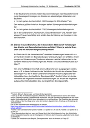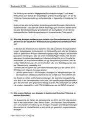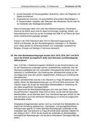 Schleswig-Holsteinischer Landtag - 19. Wahlperiode Drucksache 19/1756 In der Baubranche sind dies neben Bauvoranmeldungen nach Baustellenverord- nung überwiegend Anzeigen von Arbeiten an asbesthaltigen Materialien und Bauteilen: • Im Jahr gehen durchschnittlich 1843 Anzeigen für ASI-Arbeiten ein. 16 Den weitaus größten Anteil an Anzeigen stellen Schwangerschaftsmitteilungen dar: • Im Jahr gehen durchschnittlich 7750 Schwangerschaftsmitteilungen ein. Da in den Leitbranchen „Hochschulen, Gesundheitswesen" und „Handel“ über- wiegend Frauen beschäftigt sind, erklärt dies die Häufung von Anzeigen in die- sen Branchen. 34. Gibt es im Land Branchen, die im besonderen Maße durch Verletzungen des Arbeits- und Gesundheitsschutzes auffallen? Wenn ja, welche Bran- chen und mit welchen Mängelschwerpunkten? Auf Basis der für die Jahresberichte 17 erstellten Auswertungen lassen sich u.a. an Hand der Anzahl von Beanstandungen, Untersuchungen von Unfällen, Anord- nungen und Verwarnungen Tendenzen erkennen, welche Leitbranchen im be- sonderen Maße durch Verletzungen des Arbeits- und Gesundheitsschutzes auf- 18 fallen . Von einer Auffälligkeit innerhalb einer Leitbranche kann ausgegangen werden, wenn z. B. in dieser Leitbranche das Verhältnis der Anzahl der erfassten Bean- 19 standungen zu der in dieser Leitbranche erfassten Anzahl aufgesuchter Be- 20 triebsstätten bzw. durchgeführter Dienstgeschäfte deutlich höher ist, als das Verhältnis der insgesamt erfassten Beanstandungen zur Anzahl der insgesamt aufgesuchten Betriebsstätten bzw. durchgeführten Dienstgeschäfte. 16 Asbest- Abbruch- Sanierungs- und Instandhaltungsarbeiten 17 Gem. § 23 Abs. 4 Arbeitsschutzgesetz (ArbSchG) ist das Sozialministerium als für den Arbeits- schutz zuständige oberste Landesbehörde verpflichtet, über die Überwachungstätigkeit der ihm unter- stellten Vollzugsbehörde StAUK einen Jahresbericht zu veröffentlichen. Die Erstellung des Jahresbe- richts erfolgt auf der Grundlage einer unter den Ländern abgestimmten „Anleitung zur Erstattung der Jahresberichte“. Link zu den Jahresberichten Arbeitsschutz im Internet: https://www.schleswig-holstein.de/DE/Fachinhalte/A/arbeitsschutz/akkordeon_staatlicherArbeits- schutz_pdf.html 18 Siehe in den Jahresberichten jeweils Tabelle 3.1, Spalten 21, 24 und 25; Tabelle 3.2, Spalten 6, 8, 12 und 13. 19 Eine Beanstandung liegt vor, wenn ein Mangel durch die Aufsichtsbeamtin bzw. den Aufsichtsbe- amten festgestellt, bewertet und der Arbeitgeber im Rahmen des Ermessens aufgefordert wird, diesen zu beseitigen. 20 Siehe zum Verständnis des Begriffs „Dienstgeschäfte“ auch die Antwort zu Frage 27