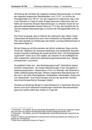 Drucksache 19/1756 Schleswig-Holsteinischer Landtag - 19. Wahlperiode 2018 betrug das Verhältnis der insgesamt erfassten Beanstandungen zur Anzahl der insgesamt aufgesuchten Betriebsstätten rund 171% , zur Summe der21 22 Dienstgeschäfte rund 136 % . Von den insgesamt 24 Leitbranchen liegt in den in der Übersicht zu Frage 34 (siehe Anlage) genannten Leitbranchen das Ver- hältnis der Anzahl der erfassten Beanstandungen zur erfassten Anzahl der auf- gesuchten Betriebsstätten deutlich höher als 171% bzw. das Verhältnis der An- zahl der erfassten Beanstandungen zur Summe der Dienstgeschäfte höher als 136 %. Die Praxis hat gezeigt, dass im Rahmen der Leitbranche „Bau, Steine, Erden“ insbesondere die Baubranche durch hohe Unfallzahlen auf Baustellen auffällt. Dies weist ebenfalls auf Verletzungen des Arbeits- und Gesundheitsschutzes im besonderen Maße hin. Bei der Erfassung und Dokumentation der jährlich anfallenden Daten wird die Anzahl der Tätigkeiten der Arbeitsschutzbehörden (hier beispielhalft: Beanstan- dungen) branchenunabhängig den jeweils berührten Sach- und Rechtsgebieten 23 zugeordnet . Daher ist es nicht möglich, die Ursachen für die Auffälligkeit der oben aufgeführten Leitbranchen Beanstandungsschwerpunkten bzw. „Mängel- schwerpunkten“ zuzuordnen. Grundsätzlich finden sich - dem Besichtigungskonzept 24 „Behördliche System- kontrolle“ entsprechend - die meisten Beanstandungen in dem Sachgebiet Ar- beitsschutzorganisation, insbesondere in Form von fehlender oder fehlerhaft er- stellter Gefährdungsbeurteilungen. Weitere vorgefundene Beanstandungen fin- den sich in den Sach-/Rechtsgebieten „Arbeitsplätze, Arbeitsstätten, Ergonomie“ und „Gefahrstoffe“. Auch hierauf bezogen sind aus den genannten Gründen, keine branchenspezifischen Aussagen möglich. Hinweise auf jahrelange Mängel im Gesundheitsschutz in bestimmten Branchen können auch durch statistische Auswertungen anerkannter Berufskrankheiten gewonnen werden (siehe dazu Antwort zu Frage 48). 21 Prozentzahl > 100 möglich, weil eine besichtigte Betriebsstätte nur einmal als „aufgesucht“ erfasst wird, auch wenn sie aufgrund der Beanstandungen mehrfach aufgesucht werden muss 22 Prozentzahl > 100 möglich, weil einem Dienstgeschäft mehrere Beanstandungen zugeordnet wer- den können 23 Diese in Tabelle 4 des Jahresberichts vorgenommene Zuordnung entspricht der Anleitung zur Er- stattung der Jahresberichte. 24 Siehe hierzu ausführlicher Antwort zu Frage 31.