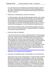 Drucksache 19/1756 Schleswig-Holsteinischer Landtag - 19. Wahlperiode len in der Regel immer eine Verbesserung der Arbeitsschutzsituation. Diese ha- ben daher im Arbeitsschutzkonzept eine höhere Priorität als Regelbesichtigun- gen erhalten. Aktuell laufen drei Kampagnen/Schwerpunktaktionen (Siehe auch Antwort zu Frage 19): • Überprüfung von Biogasanlagen (Leitbranche Versorgung) In Schleswig-Holstein werden über 560 Biogasanlagen betrieben, davon unterlie- gen etwa 160 Anlagen der Störfallverordnung. Bei einer von Umweltministerium und Landesamt für Landwirtschaft, Umwelt und ländliche Räume (LLUR) seit 2015 durchgeführten „Schwerpunktaktion Biogasanlagen“ wurden erhebliche Verstöße gegen die Vorschriften der Betriebssicherheitsverordnung und der Ge- fahrstoffverordnung festgestellt, vor allem hinsichtlich des Explosionsschutzes. Seit 2016 führen die StAUK und das LLUR die Schwerpunktaktion gemeinsam durch, mit dem Ziel, die Betreiber über ihre Arbeitsschutzpflichten zu informieren und auf deren Umsetzung hinzuwirken. • „Kampf dem Krebs am Arbeitsplatz“ In den Jahren 2016 und 2017 wurden in Schleswig-Holstein 716 Fälle angezeigt, in denen der Verdacht auf eine berufsbedingte Krebserkrankung besteht. Außer- dem wurde in diesem Zeitraum in 312 Fällen anerkannt, dass eine berufsbe- dingte Krebserkrankung vorliegt. Diese verlaufen oft tödlich. Gefährdet können z.B. Arbeitskräfte sein, die jahrzehntelang an Tankstellen, bei der Heizöllieferung oder Tankreinigung den Einwirkungen von Benzol und Blei ausgesetzt sind. Dementsprechend hat das Sozialministerium 2018 eine Schwerpunktaktion „Kampf dem Krebs“ begonnen. Damit sollen nach und nach Arbeitgeber und Be- schäftige gezielt über die Ursachen berufsbedingter Krebserkrankungen und über mögliche Schutzmaßnahmen informiert werden. Gleichzeitig wird die Um- setzung der Maßnahmen im Betrieb überprüft: https://www.schleswig-holstein.de/DE/Fachinhalte/A/arbeitsschutz/Downloads/ar- beitsschutz_Flyer_KrebspraeventionArbeitsplatz.pdf. • Unterkünfte und Arbeitsbedingungen von Beschäftigten in der Fleischwirtschaft Anfang 2018 wurden bei einer Großschlachterei in Schleswig-Holstein erhebliche Mängel bei der Unterbringung von Beschäftigten vor allem aus Osteuropa be- kannt. Diese Beschäftigten sind überwiegend bei Subunternehmen beschäftigt. Da diese Zustände keinen Einzelfall darstellen, hat das Sozialministerium unter Beteiligung der StAUK und anderer Behörden die Überprüfungs- und Informati- onskampagne „Unterkünfte von Beschäftigten in der Fleischwirtschaft“ gestartet. Die StAUK überprüft ebenfalls die Arbeitsbedingungen. Im Zusammenhang mit der Kampagne hat das Sozialministerium einen Flyer „Arbeiten und Wohnen in