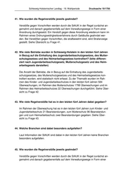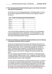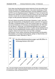 Schleswig-Holsteinischer Landtag - 19. Wahlperiode Drucksache 19/1756 47. Wie viele begutachtete Berufskrankheiten gab es in den letzten fünf Jahren? (bitte jährlich aufschlüsseln) Die Anzahl der von den Landesgewerbeärzten in Schleswig-Holstein in den letz- ten fünf Jahren begutachteten Berufskrankheiten ist der folgenden Tabelle zu entnehmen: Jahr Anzahl der begutachteten Berufskrankheiten 2014 5 2015 112 2016 163 2017 136 2018 116 In 2014 wurde infolge der Wahrnehmung des Vorsitzes und der Geschäftsfüh- rung des Länderausschusses für Arbeitsschutz und Sicherheitstechnik - LASI - durch Schleswig-Holstein) die Mitwirkung der Landesgewerbeärzte im Berufs- krankheiten-Feststellungsverfahren reduziert. 48. Gab es eine Häufung von bestimmten Berufskrankheiten oder eine Häufung in bestimmten Branchen? Wenn ja, welche? Gemäß der Berufskrankheiten-Dokumentation der Deutschen Gesetzlichen Un- fallversicherung (DGUV) wurden von 2013 bis 2017 im Bereich der gewerblichen Berufsgenossenschaften und der Unfallversicherungsträger der öffentlichen Hand in Schleswig-Holstein insgesamt 2.574 Berufskrankheiten anerkannt. Im Bereich der Sozialversicherung für Landwirtschaft, Forsten und Gartenbau (SVLFG) wurden von 2013 bis 2017 insgesamt 233 Berufskrankheiten aner- kannt. Die sechs häufigsten Berufskrankheiten nach BK-Ziffern in Schleswig-Holstein und deren absolute Fallzahlen werden in Abb. 1 dargestellt. Die sechs Branchen in Schleswig-Holstein mit den meisten anerkannten Berufskrankheiten und deren absolute Fallzahlen werden in Abb. 2 dargestellt. Demnach steht die berufsbedingte Lärmschwerhörigkeit seit Jahren unverändert an der Spitze der anerkannten Berufskrankheiten. An zweiter Stelle steht eine durch Asbest verursachte Lungenveränderung (Asbestose) und an dritter Stelle die am 22.12.2014 neu in die Liste der Berufskrankheiten aufgenommenen Er- krankungen nach der Berufskrankheiten-Ziffer 5103 „Plattenepithelkarzinome o- der multiple aktinische Keratosen der Haut durch natürliche UV-Strahlung“.