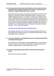 Drucksache 19/1756 Schleswig-Holsteinischer Landtag - 19. Wahlperiode 50. Gibt es gesicherte Erkenntnisse über Betriebe und Unternehmen mit einer geeigneten eigenständigen Organisation des Arbeits- und Gesundheits- schutzes (z.B. eigene Abteilung)? Wenn ja, welche? Erkenntnisse über den Aufbau der Arbeitsschutzorganisation und die für den Ar- beitsschutz wesentlichen Abläufe eines Betriebs werden im Rahmen von Be- triebsbesichtigungen gewonnen. Die StAUK ist aufgrund des Arbeitsschutzkon- 27 zepts verpflichtet, Revisionen grundsätzlich als „Behördliche Systemkontrolle“ durchzuführen. Mit diesem Instrumentarium überprüft sie das Vorhandensein und das Funktionieren einer systematischen Arbeitsschutzorganisation hinsichtlich ih- rer Eignung im Sinne des § 3 Arbeitsschutzgesetz (ArbSchG). Die konkreten In- halte können der LASI-Veröffentlichung „Grundsätze der behördlichen System- kontrolle“ – LV 54 − entnommen werden: https://lasi-info.com/publikationen/lasi-veroeffentlichungen/ Über Betriebe, die bisher noch nicht oder vor Einführung dieses unter den Län- dern abgestimmten Aufsichtskonzepts von der StAUK besichtigt wurden, liegen allerdings keine Erkenntnisse vor. 51. In wie vielen Betrieben und Organisationen gibt es entsprechende Betriebs- und Dienstvereinbarungen? Ob in Betrieben und Organisationen entsprechende Betriebs- und Dienstverein- barungen vorliegen, wird im Rahmen der behördlichen Systemkontrolle (siehe Antwort zu Frage 50) bekannt. Zahlen liegen dazu nicht vor. 52. Sind der Landesregierung diese (Muster-) Betriebsvereinbarungen be- kannt? Nein. Siehe auch Antwort zu Frage 51. 27 Konzept für den staatlichen Arbeitsschutz in Schleswig-Holstein (Arbeitsschutzkonzept) vom 19.12.2017