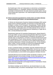 Drucksache 19/1756 Schleswig-Holsteinischer Landtag - 19. Wahlperiode Die Empfehlungen richten sich insbesondere an Unternehmen und betriebliche Arbeitsschutzakteure (u.a. Arbeitgeber, Betriebs-/Personalräte, Betriebsärzte, Fachkräfte für Arbeitssicherheit). Sie sollen Orientierung darüber geben, wie psy- chische Belastungen angemessen in der Gefährdungsbeurteilung berücksichtigt werden können. 55. Welche Unterstützungsmaßnahmen erhalten kleine und mittlere Betriebe bei der Einhaltung des Arbeits- und Gesundheitsschutzes? Im Rahmen der Gemeinsamen Deutschen Arbeitsschutzstrategie (GDA) werden gezielt Anreize für Betriebe geschaffen, die Sicherheit und Gesundheit der Be- schäftigten zu stärken. Durch Kampagnen, Veranstaltungen, Projekte, Betriebs- besichtigungen und Beratungen sowie gezielte Öffentlichkeitsarbeit werden Be- triebe unterstützt. Insbesondere kleine und mittlere Betriebe können auf den In- ternetseiten besonderer GDA-Arbeitsprogramme Hilfestellung zu Fragen des Ar- beits- und Gesundheitsschutzes finden. Beispielsweise bietet das 2014 gestartete Arbeitsprogramm „Muskel-Skelett-Er- krankungen (MSE)“ auf seinem branchenübergreifendem MSE-Portal (www.gda- bewegt.de) neben einer Produktdatenbank umfangreiche Informationen und wertvolle Tipps zum Identifizieren und Senken von Muskel-Skelett-Erkrankungen. Das Arbeitsprogramm Psyche „Stress reduzieren-Potenziale entwickeln“ gibt un- ter anderem Informationen zur Durchführung einer Gefährdungsbeurteilung zu psychischen Belastungen im Betrieb (www.gda-psyche.de), und das Arbeitspro- gramm „ORGA““ hat eine Praxishilfe zum Check der grundlegenden Arbeits- schutzorganisation im Betrieb entwickelt (www.gda-orgacheck.de). Auf den in Schleswig-Holstein veranstalteten regionalen Arbeitsschutzforen wer- den Multiplikatoren von Verbänden, Gewerkschaften, Kammern etc. die Inhalte und die Handlungshilfen der jeweiligen GDA-Programme vorgestellt und über die vom Sozialministerium und der StAUK konkret geplanten Aktivitäten informiert. Individuelle Beratung durch die StAUK erhalten die Betriebe im Rahmen von Be- triebsbesichtigungen und bei direkten Anfragen. Auf den Internetseiten der StAUK (https://www.uk-nord.de/staatliche-arbeitsschutzbehoerde-bei-der-unfall- kasse-nord/ ) und des Sozialministeriums (https://www.schleswig-holstein.de/DE/Themen/A/arbeitsschutz.html) stehen Informationsmaterialien und Anzeigevordrucke zu verschiedenen Arbeits- schutzthemen zur Verfügung. Des Weiteren beteiligen sich die StAUK bzw. das Sozialministerium am „Lübe- cker Arbeitsschutztag“ und anderen Veranstaltungen mit der IHK und der Hand-