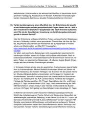 Schleswig-Holsteinischer Landtag - 19. Wahlperiode Drucksache 19/1756 werkskammer Lübeck sowie an der während der NordBau in Neumünster durch- geführten Fachtagung „Arbeitsschutz im Wandel“. Auf beiden Veranstaltungen werden interessierte Betriebe zu aktuellen Arbeitsschutzthemen informiert. 56. Hat die Landesregierung einen Überblick über die Entwicklung der psychi- schen Belastungen und der gesundheitlichen Folgen dieser hier im Land in den verschiedenen Branchen? (Ergebnisse bitte nach Branchen aufschlüs- seln) Wie ist der Stand bei der Umsetzung von Gefährdungsbeurteilungen gerade in diesem Bereich? Über die Entwicklung und gesundheitlichen Folgen von psychischen Belastungen gibt es in Schleswig-Holstein keine gesonderten Erkenntnisse, die über die Stu- die „Psychische Gesundheit in der Arbeitswelt“ der Bundesanstalt für Arbeits- schutz und Arbeitsmedizin von Mai 2017 hinausgehen: https://www.baua.de/DE/Angebote/Publikationen/Berichte/Psychische-Gesund- heit.html Vor allem, weil psychische Belastungen nicht zwangsläufig in psychischen Er- krankungen münden, lassen sich Folgen nicht präzise aufschlüsseln. Nach ar- beitswissenschaftlichen und arbeitsmedizinischen Erkenntnissen können als ne- gative Folgen von psychischen Belastungen z.B. ebenso Muskel-Skelett-Erkran- kungen wie Herz-Kreislauf-Erkrankungen auftreten. In Schleswig-Holstein erhebt jede der gesetzlichen Krankenkassen eigene Statis- tiken zu Krankenständen. Muskel-Skelett-Erkrankungen führen seit Jahren mit großem Abstand zu den meisten Fehltagen. Die Branchen mit den jeweils höchs- ten Arbeitsunfähigkeits-Zahlen unterscheiden sich hingegen im Vergleich der Krankenkassen, vermutlich mitbedingt durch die unterschiedliche Versicherten- Struktur. So meldete 2018 der AOK Landesverband Nordwest die häufigsten Fehltage bei Reinigungskräften (35,7 Tage), Beschäftigten der Ver- und Entsor- gung (31,3 Tage) und Kranführern (29,9 Tage). Die Landesvertretung der BAR- MER berichtete im selben Zeitraum über höchste Krankenstände bei Busfah- rer/innen (33 Tage), dicht gefolgt von Beschäftigten in der Altenpflege (31 Tage). Im Rahmen der Gemeinsamen Deutschen Arbeitsschutzstrategie führte die StAUK das „Arbeitsprogramm Psyche: Schutz und Stärkung der Gesundheit bei arbeitsbedingter psychischer Belastung“ in den Jahren 2016 und 2017 durch. Mit Schwerpunkt der Leitbranche LB 5 „Gesundheitswesen“ wurden insgesamt 167 Betriebe verschiedener Größenklassen und Leitbranchen aufgesucht. Weitere überprüfte Leitbranchen neben dem Gesundheitswesen waren: Nahrungs- und Genussmittel; Handel; Verkehr; Dienstleistungen sowie Öffentliche Verwaltung.