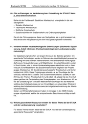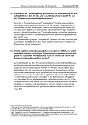 Drucksache 19/1756 Schleswig-Holsteinischer Landtag - 19. Wahlperiode 60. Gibt es Planungen zur Veränderung bzw. Entwicklung der STAUK? Wenn ja, diese bitte beschreiben. Bisher ist der Fachbereich Staatlicher Arbeitsschutz untergliedert in die vier Sachgebiete • Sozialer Arbeitsschutz • Technischer Arbeitsschutz • Stofflicher Arbeitsschutz • Sozialvorschriften im Straßenverkehr und Ordnungswidrigkeiten Da sich die Führungsspanne dieser vier Sachgebiete als zu groß erwiesen hat, wird derzeit eine Neugliederung mit fünf Vollzugssachgebieten vorbereitet. 61. Inwieweit werden neue technologische Entwicklungen (Stichworte: Digitali- sierung, Arbeit 4.0) in der Arbeitsschutzstrategie der Landesregierung be- rücksichtigt? Die Digitalisierung hat schon seit langem Einzug in die Betriebe gehalten. Ent- sprechende Technologien werden im Rahmen der Aufsichtstätigkeit genauso be- rücksichtigt wie alle anderen Arbeitsverfahren. Neu entstehende Handlungsbe- darfe sowie Herausforderungen und Möglichkeiten für Aufsichtshandeln werden in Bund-Länder- oder in reinen Länderarbeitsgruppen identifiziert und zu lösen versucht. Eine Mitarbeiterin des Sozialministeriums ist Mitglied in der Projekt- gruppe Arbeitsschutz 4.0 des Länderausschusses für Arbeitsschutz und Sicher- heitstechnik (LASI). Diese Projektgruppe arbeitet u.a. auf Grundlage der Be- schlüsse, welche die 93. Arbeits- und Sozialministerkonferenz (ASMK) im Jahr 2016 zu den Themen Arbeitsschutz 4.0 und Arbeit 4.0 gefasst hat. Zu ihren Auf- gaben gehören die Fertigstellung des Strategiepapiers zum Arbeitsschutz 4.0 so- wie die Erarbeitung von konkreten Maßnahmenvorschlägen für die Weiterent- wicklung des Arbeitsschutzes und von Vorschlägen zur notwendigen Weiterent- wicklung des Arbeitsschutzrechts sowie der Aufgabenwahrnehmung der Arbeits- schutzverwaltung. Sozial- und Wirtschaftsministerium haben im Vorwege in der ASMK-Arbeits- gruppe mitgearbeitet, welche die entsprechenden Beschlussvorschläge erstellt hat. 62. Welche gesonderten Ressourcen werden für dieses Thema bei der STAUK und der Landesregierung vorgehalten? Für dieses Thema werden weder bei der StAUK noch bei der Landesregierung „gesonderte Ressourcen“ vorgehalten.