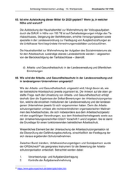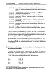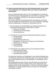 Schleswig-Holsteinischer Landtag - 19. Wahlperiode Drucksache 19/1756 63. Welche finanziellen Mittel stellt das Land Schleswig-Holstein für den staatli- chen Arbeitsschutz zur Verfügung? (Bitte nach einzelnen Haushaltstiteln aufschlüsseln) Das Land Schleswig-Holstein stellt zum einen Haushaltsmittel zur Finanzierung der Wahrnehmung der Vollzugsaufgaben durch die StAUK zur Verfügung. Hierfür stehen im Haushaltstitel 1004 685 01 für das laufende Haushaltsjahr 2019 8.089 T€ zur Verfügung. Zum anderen stellt das Land Schleswig-Holstein Haushaltsmittel zur Wahrneh- mung der Aufgaben des Sozialministeriums als für den Arbeitsschutz zuständige oberste Landesbehörde zur Verfügung. Zu unterscheiden sind hier: 1. die Personalkosten für die Beschäftigten des Arbeitsschutzreferates (zum Umfang der Personalressourcen siehe Antwort zu Frage 8) • Besoldung, Tarifentgelt • Lohnfortzahlung im Krankheitsfall • Jahressonderzahlung 2. die Sachkosten, die das Personal des Arbeitsschutzreferates verursacht • Dienstreisekosten • Geschäftsbedarf • Arbeitsmedizinische Betreuung • Bereitstellung von Büros (incl. Reinigung und Instandhaltung) • Bereitstellung von Parkfläche • EDV-Ausstattung • Fortbildungskosten 3. Personalkosten, die ausgelöst werden durch das Arbeitsschutzreferat • Abteilungsleitung (anteilig) • Personalverwaltung (anteilig) • Serviceleistungen (anteilig) Eine technische Zuordnung von Einzelbelegen zu den einzelnen Mitarbeiterinnen und Mitarbeitern, Referaten oder Abteilungen erfolgt nicht, so dass eine tatsächli- che, summenmäßige Zuordnung von Einzelbeträgen zu Haushaltstiteln nicht er- folgen kann. Aus verwaltungsökonomischen Gründen findet die Berechnung im Bereich des Sozialministeriums anhand der anteiligen Kosten an den Gesamtkosten statt. Insgesamt werden für das Sozialministerium 1.338 T€ für den Bereich staatlicher Arbeitsschutz zur Verfügung gestellt. Diese sind anteilig in den nachfolgenden Haushaltstiteln enthalten: