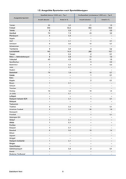 1.2. Ausgeübte Sportarten nach Sportstättentypen Spielfeld (kleiner 5.000 qm) - Typ 1 Großspielfeld (mindestens 5.000 qm) - Typ 2 Ausgeübte Sportart Anzahl absolut Anteil in % Anzahl absolut Anteil in % Turnen 30 3,0 21 1,5 Fußball 549 54,5 883 64,9 Tennis 9 0,9 7 0,5 Handball 74 7,3 43 3,2 Pferdesport 4 0,4 – – Segeln – – – – Golf 1 0,1 1 0,1 Schützen 6 0,6 10 0,7 Schwimmen – – – – Tischtennis 9 0,9 3 0,2 Leichtathletik 145 14,4 268 19,7 Tanzen 3 0,3 2 0,1 Reha- u. Behindertensport 8 0,8 13 1,0 Volleyball 45 4,5 21 1,5 Sportfischen – – 3 0,2 Badminton 3 0,3 4 0,3 Judo 1 0,1 – – Rudern – – – – Basketball 79 7,8 10 0,7 Karate – – 1 0,1 Kanu – – – – Kegeln – – 2 0,1 Boxen 1 0,1 – – Schach – – – – Tauchen – – – – Hockey 16 1,6 19 1,4 Ju-Jutsu 1 0,1 – – Luftsport – – – – Radsport-Verband BDR 1 0,1 1 0,1 Rollsport – – – – Taekwondo – – – – Triathlon 4 0,4 1 0,1 American Football 4 0,4 26 1,9 Motorjacht – – – – Floorball – – 1 0,1 Motorsport SH – – – – Skilauf 1 0,1 – – Aikido 1 0,1 – – Fechten – – – – Eissport 1 0,1 – – Baseball 6 0,6 19 1,4 Billard – – – – Squash – – – – Minigolf – – – – Radsport-Solidarität 1 0,1 – – Ringen – – – – Gewichtheben – – – – Gehörlosensport 4 0,4 2 0,1 Kendo – – – – Moderner Fünfkampf – – – – Statistikamt Nord 8