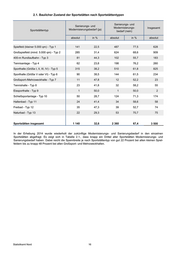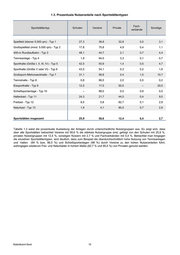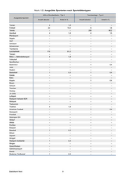 Noch: 1.2. Ausgeübte Sportarten nach Sportstättentypen 400-m Rundlaufbahn - Typ 3 Tennisanlage - Typ 4 Ausgeübte Sportart Anzahl absolut Anteil in % Anzahl absolut Anteil in % Turnen 4 1,8 – – Fußball 22 10,0 5 1,8 Tennis – – 259 95,2 Handball 4 1,8 4 1,5 Pferdesport – – – – Segeln – – – – Golf – – – – Schützen – – – – Schwimmen – – – – Tischtennis – – – – Leichtathletik 179 81,0 – – Tanzen – – – – Reha- u. Behindertensport 4 1,8 – – Volleyball – – – – Sportfischen – – – – Badminton – – 1 0,4 Judo – – – – Rudern – – – – Basketball 1 0,5 1 0,4 Karate – – – – Kanu – – – – Kegeln – – 1 0,4 Boxen – – – – Schach – – – – Tauchen – – – – Hockey – – – – Ju-Jutsu – – – – Luftsport – – – – Radsport-Verband BDR – – – – Rollsport – – – – Taekwondo – – – – Triathlon 4 1,8 – – American Football – – 1 0,4 Motorjacht – – – – Floorball – – – – Motorsport SH – – – – Skilauf – – – – Aikido – – – – Fechten – – – – Eissport – – – – Baseball 1 0,5 – – Billard – – – – Squash – – – – Minigolf – – – – Radsport-Solidarität 1 0,5 – – Ringen – – – – Gewichtheben – – – – Gehörlosensport – – – – Kendo – – – – Moderner Fünfkampf 1 0,5 – – Statistikamt Nord 9