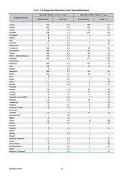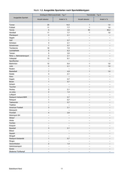 Noch: 1.2. Ausgeübte Sportarten nach Sportstättentypen Sporthalle (Größe I, II, III, IV) - Typ 5 Sporthalle (Größe V oder VI) - Typ 6 Ausgeübte Sportart Anzahl absolut Anteil in % Anzahl absolut Anteil in % Turnen 722 17,0 189 11,4 Fußball 494 11,6 201 12,1 Tennis 49 1,2 19 1,1 Handball 309 7,3 207 12,5 Pferdesport 6 0,1 2 0,1 Segeln 6 0,1 – – Golf 6 0,1 1 0,1 Schützen 31 0,7 7 0,4 Schwimmen 1 0,0 – – Tischtennis 356 8,4 95 5,7 Leichtathletik 259 6,1 120 7,2 Tanzen 284 6,7 61 3,7 Reha- u. Behindertensport 145 3,4 35 2,1 Volleyball 357 8,4 171 10,3 Sportfischen – – 1 0,1 Badminton 269 6,3 157 9,5 Judo 106 2,5 33 2,0 Rudern 8 0,2 – – Basketball 269 6,3 135 8,1 Karate 133 3,1 26 1,6 Kanu 5 0,1 – – Kegeln 1 0,0 1 0,1 Boxen 41 1,0 8 0,5 Schach 2 0,0 2 0,1 Tauchen – – – – Hockey 79 1,9 55 3,3 Ju-Jutsu 47 1,1 11 0,7 Luftsport 3 0,1 4 0,2 Radsport-Verband BDR 8 0,2 7 0,4 Rollsport 23 0,5 22 1,3 Taekwondo 46 1,1 6 0,4 Triathlon 5 0,1 2 0,1 American Football 18 0,4 9 0,5 Motorjacht – – – – Floorball 60 1,4 47 2,8 Motorsport SH 1 0,0 – – Skilauf 2 0,0 – – Aikido 23 0,5 9 0,5 Fechten 22 0,5 3 0,2 Eissport – – – – Baseball 8 0,2 6 0,4 Billard – – – – Squash 1 0,0 – – Minigolf – – – – Radsport-Solidarität 11 0,3 2 0,1 Ringen 10 0,2 1 0,1 Gewichtheben 8 0,2 3 0,2 Gehörlosensport 2 0,0 1 0,1 Kendo 4 0,1 – – Moderner Fünfkampf 1 0,0 1 0,1 Statistikamt Nord 10