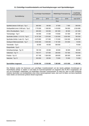 2.2. Zukünftige Investitionsbedarfe und Haushaltsplanungen nach Sportstättentypen Langfristige Kurzfristiger Haushaltsplan Mittelfristige Finanzplanung Finanzplanung Sportstättentyp 2014 2015 2015 2016 nach 2016 Euro Spielfeld (kleiner 5.000 qm) - Typ 1 805 500 66 000 57 500 7 500 358 500 Großspielfeld (mind. 5.000 qm) - Typ 2 1 770 009 1 186 500 1 418 500 749 000 2 534 880 400-m Rundlaufbahn - Typ 3 605 000 120 000 801 600 80 000 221 000 Tennisanlage - Typ 4 144 400 41 500 118 500 121 000 351 000 Sporthalle (Größe I, II, III, IV) - Typ 5 9 157 200 1 270 000 1 333 500 3 024 000 765 500 Sporthalle (Größe V oder VI) - Typ 6 5 473 800 317 000 1 172 500 1 254 500 6 260 500 Großsport-/Mehrzweckhalle - Typ 7 9 093 500 1 035 000 1 191 000 515 000 18 000 Tennishalle - Typ 8 52 000 45 000 500 000 – 70 000 Eissporthalle - Typ 9 – – – – – Schießsportanlage - Typ 10 150 100 20 000 60 000 55 000 80 000 Hallenbad - Typ 11 704 417 127 000 250 000 727 000 700 000 Freibad - Typ 12 617 180 1 004 500 309 000 305 500 55 500 Naturbad - Typ 13 933 000 85 500 73 500 74 500 74 500 Sportstätten insgesamt 29 506 106 5 318 000 7 285 600 6 913 000 11 489 380 Des Weiteren wurden die Kommunen zum zukünftigen Investitionsbedarf und den bereits getätigten Anmeldungen im Haushaltsplan befragt. In Tabelle 2.2 wird dabei ein Finanzierungsbedarf von insgesamt über 55 Mio € ausgewiesen, der sich aus kurzfristigen, mittelfristigen und langfristigen Planungen zusammensetzt. Es zeigt sich, dass vor allem Schleswig- Holsteins Sporthallen und Großspielfelder einen hohen Sanierungsbedarf haben, aber auch für Bäder und kleine Spielfelder haben Städte und Gemeinden größeren Bedarf angemeldet. Statistikamt Nord 17