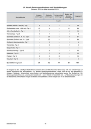 3.1. Aktuelle Sanierungsmaßnahmen nach Sportstättentypen Zeitraum: 2012 bis Mitte November 2013 Boden- und Anlagen- Gebäude- Schwimmbad- Spielfeld- Insgesamt Sportstättentyp sanierungen sanierungen sanierungen sanierungen Anzahl Spielfeld (kleiner 5.000 qm) - Typ 1 6 2 – 6 14 Großspielfeld (mind. 5.000 qm) - Typ 2 13 4 – 12 29 400-m Rundlaufbahn - Typ 3 7 – – 6 13 Tennisanlage - Typ 4 4 1 – 4 9 Sporthalle (Größe I, II, III, IV) - Typ 5 – 28 – 9 37 Sporthalle (Größe V oder VI) - Typ 6 – 22 – 7 29 Großsport-/Mehrzweckhalle - Typ 7 – 3 – 1 4 Tennishalle - Typ 8 – 6 – 2 8 Eissporthalle - Typ 9 – – – – – Schießsportanlage - Typ 10 – 5 – 7 12 Hallenbad - Typ 11 – 7 5 – 12 Freibad - Typ 12 8 2 8 – 18 Naturbad - Typ 13 1 2 1 – 4 Sportstätten insgesamt 39 82 14 54 189 Im Vergleich zu den zukünftigen Maßnahmen zwischen 2012 und Mitte November 2013 bezog sich eine weitere Frage auf bereits begonnene oder durchgeführte, d.h. aktuelle Sanierungsmaßnahmen, wobei nach der Art der Maßnahme in Anlagen-, Gebäude-, Schwimmbad- sowie Boden- und Spielfeldsanierung unterschieden wurde. Der Großteil der 189 Sanierungsmaßnahmen, die zurzeit laufen, bezieht sich – wie in Tabelle 3.1 ersichtlich wird – auf Gebäudesanierungen mit 82 Maßnahmen, 54 Vorhaben erfolgen bei Böden und Spielfeldern, 39 bei Anlagen und 14 bei Schwimmbädern. Statistikamt Nord 18