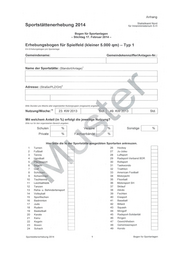 Anhang 25 Tauchen |] 50 Moderner Fünfkampf L_] _ Bitte wenden 1 = Kommune* 2 = sonstige öffentliche Hand“ 3 = Verein, Verband, sonst. gemeinnützige Org.” Art des Betreibers: = kleiner 1.300 qm =1 1 2 300 qm bis kleiner 5.000 qm 2 = Tenne 3 = Kunststoffrasen 4 = Sonstiger (Kunststoff etc.) Spielfeldbelag: 1 = bis 2000 2 = 2001 bis 2005 3 = 2006 bis 2010 4 = ab 2011 Spielfeldgröße:® | | Baujahr bzw. letzte Generalsanierung/Modernisierung: r 1=ja 2=nein Sanierungs-/Modernisierungsbedarf: Wenn ja, bitte bereits veranschlagte Aufwendungen für diese Sportstätte angeben: Hier bitte nur Beträge für Sanierungs-/Modernisierungsmaßnahmen angeben, die von der Kommunalverwaltung für die Anlage bereits beschlossen aber noch nicht begonnen wurden! Für aktuelle Maßnahmen seit 2012 bitte den nächsten Absatz ausfüllen! ur < Im Haushaltsplan für 2014 veranschlagt: Im Haushaltsplan für 2015 veranschlagt: i eb c | In der mittelfristigen Finanzplanung für 2015 vorgesehen: u € In der mittelfristigen Finanzplanung für 2016 vorgesehen: | e| In der Finanzplanung für nach 2016 vorgesehen: I € | Wird bei dieser Sportstätte bzw. diesem Bad aktuell eine Sanierung durchgeführt? Bitte alle Maßnahmen mit einem Gesamtvolumen von mehr als 25.000 € der Jahre 2012 bis Mitte November 2013 aufführen! Art der Maßnahme: . . Welche Kosten'wurden für die Maßnahme kalkuliert? | € | Welche Kosten wurden bisher bereits abgerechnet? | € | Wie wurden die Kosten anteilig (in %) auf die Sanierungsmaßnahmen aufgeteilt? Kreis Landessportverband % Sonstige % Kommune Vereine % Land Sponsoren % Sportstättenerhebung 2014 2 Bogen für Sportanlagen