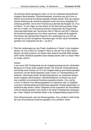 Schleswig-Holsteinischer Landtag - 18. Wahlperiode Drucksache 18/1540 Die einzelnen Beratungsregionen sollen vor Ort von landesweit übergreifenden Aufgaben (Berichtswesen, Öffentlichkeitsarbeit, Koordinierung) durch eine zu- sätzlich einzurichtende Koordinierungsstelle entlastet werden. Über die organisa- torische Anbindung der Koordinierungsstelle wurde noch keine endgültige Ent- scheidung getroffen. Ziel ist eine Finanzierung außerhalb des Budgets von „Frau und Beruf“, um die Träger von den Kosten für die Wahrnehmung dieser Aufga- ben frei zu halten. Zur Finanzierung kommen insbesondere die Programmab- wicklungsmöglichkeiten der Technischen Hilfe im Rahmen des ESF in Betracht. Die Koordinierungsstelle kann ihre Arbeit aufnehmen, sobald die Europäische Kommission das Operationelle Programm der Landesregierung zum ESF ge- nehmigt hat und alle vertraglichen Vereinbarungen mit dem neuen Dienstleister getroffen sind. Angestrebt wird der 1. Juli 2014. 7. Plant die Landesregierung, das Projekt „Ausbildung in Teilzeit“ in den Aufgaben- bereich von Frau & Beruf zu verlagern? Wenn ja, wie soll Frau & Beruf diesen Bereich zukünftig umsetzen und werden dafür weitere finanzielle Mittel bereitge- stellt? Sollen alle Beratungsstellen daran beteiligt werden oder nur einige? Wenn nur einige, welche? Antwort: In der neuen ESF-Förderperiode soll der Aufgabenschwerpunkt der individuellen Beratung von Frauen weiter gestärkt werden. Der Anteil der Individualberatung wird künftig einen Umfang von 70 % der Aufgabenstellung einer Beratungsregion einnehmen und den Beratungsbedarf junger Frauen zur Teilzeitausbildung mit abdecken. Gleichzeitig werden die Beratungsregionen von landesweit übergrei- fenden Aufgaben (Berichtswesen, Öffentlichkeitsarbeit, Koordinierung) durch eine zusätzlich einzurichtende Koordinierungsstelle entlastet. „Frau und Be- ru“kann im Rahmen ihrer Beratungstätigkeit zum Abschluss oder zur Stabilisie- rung eines Teilzeitausbildungsverhältnisses gegenüber Ausbildungsbetrieben un- terstützend tätig werden. Diesen Tätigkeiten wurde ausweislich der Geschäftsbe- richte der Beratungsstellen auch bereits in der letzten Förderperiode nachgegan- gen. Diese Tätigkeit wird deshalb wieder in den Aufgabenkatalog aufgenommen. Einen Wissenstransfer unter den Beratungsstellen „Frau und Beruf“ stellt künftig die noch einzurichtende Koordinierungsstelle „Frau und Beruf“ sicher. 5