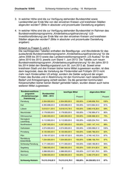 Drucksache 18/945 Schleswig-Holsteinischer Landtag - 18. Wahlperiode 3. In welcher Höhe sind die zur Verfügung stehenden Bundesmittel sowie Landesmittel per Ende Mai von den einzelnen Kreisen und kreisfreien Städten abgerufen worden? (Bitte in absoluter und prozentualer Darstellung angeben) 4. In welcher Höhe sind die zur Verfügung stehenden Bundesmittel im Rahmen des Bundesinvestitionsprogramms „Kinderbetreuungsfinanzierung“ (U3- Investitionsförderung) per Ende Mai von den einzelnen Kreisen und kreisfreien Städten abgerufen worden? (Bitte in absoluter und prozentualer Darstellung angeben) Antwort zu Fragen 3. und 4.: Die nachfolgenden Tabellen enthalten die Bewilligungs- und Abrufstände für das auslaufende Bundesinvestitionsprogramm „Kinderbetreuungsfinanzierung“ für die Jahre 2008 bis 2013 sowie das Landesinvestitionsprogramm „U3-Ausbau“ für die Jahre 2010 bis 2013, jeweils zum Stand 1. Juni 2013. Die Tabelle zum neuen Bundesinvestitionsprogramm „Kinderbetreuungsfinanzierung“ für die Jahre 2013 bis 2014 bildet den Bewilligungsstand zum 30. Juni 2013 ab. Soweit einer kreisfreien Stadt und drei Kreisen bisher keine Mittel zugewiesen wurden, ist dies darin begründet, dass die Verteilung der Fördermittel seit Frühjahr 2013 nicht mehr nach Kinderzahlen U3 erfolgt, sondern die Gelder aufgrund der engen Fristen des Bundes und in Abstimmung mit den Kommunen nach tatsächlichem Bedarf und Antragseingang verteilt werden. Da die genannten kommunalen Körperschaften bisher keinen Bedarf gemeldet haben, wurden diesen auch keine weiteren Mittel zugewiesen. Bundesinvestitions bewilligte Mittel abgerufene Mittel programm Bundesmittel „Kinderbetreuungs- 2008 – 2013 Prozent Prozent finanzierung“ Flensburg 2.354.000,00 € 2.354.000,00 € 100,00% 2.349.656,76 € 100% Kiel 6.355.698,00 € 6.355.698,00 € 100,00% 5.813.664,34 € 91% Lübeck 5.618.511,00 € 5.618.510,76 € 100,00% 3.883.418,26 € 69% Neumünster 2.179.000,00 € 2.179.000,00 € 100,00% 1.742.994,47 € 80% Dithmarschen 3.465.000,00 € 3.465.000,00 € 100,00% 2.606.968,32 € 75% Herzogtum 5.112.000,00 € 5.112.000,00 € 100,00% 4.820.234,79 € 94% Lauenburg Nordfriesland 4.297.000,00 € 4.297.000,00 € 100,00% 3.801.147,14 € 88% Ostholstein 4.574.000,00 € 4.574.000,00 € 100,00% 4.555.099,01 € 100% Pinneberg 8.120.000,00 € 8.120.000,00 € 100,00% 6.665.766,03 € 82% Plön 3.159.107,02 € 3.159.107,02 € 100,00% 2.740.142,72 € 87% Rendsburg- 7.234.000,00 € 7.234.000,00 € 100,00% 6.986.156,79 € 97% Eckernförde Schleswig-Flensburg 5.171.000,00 € 5.171.000,00 € 100,00% 4.920.186,95 € 95% Segeberg 7.088.000,00 € 7.088.000,00 € 100,00% 5.651.814,92 € 80% Steinburg 3.388.000,00 € 3.388.000,00 € 100,00% 2.217.401,78 € 65% Stormarn 6.098.000,00 € 6.098.000,00 € 100,00% 5.482.270,84 € 90% Schleswig-Holstein 74.213.316,02 € 74.213.315,78 € 100,00% 64.236.923,12 € 87% 2