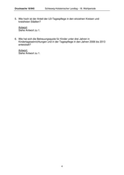 Drucksache 18/945 Schleswig-Holsteinischer Landtag - 18. Wahlperiode 5. Wie hoch ist der Anteil der U3-Tagespflege in den einzelnen Kreisen und kreisfreien Städten? Antwort: Siehe Antwort zu 1. 6. Wie hat sich die Betreuungsquote für Kinder unter drei Jahren in Kindertageseinrichtungen und in der Tagespflege in den Jahren 2006 bis 2013 entwickelt? Antwort: Siehe Antwort zu 1. 4