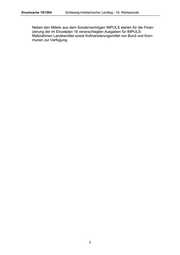Drucksache 19/1594 Schleswig-Holsteinischer Landtag - 19. Wahlperiode Neben den Mitteln aus dem Sondervermögen IMPULS stehen für die Finan- zierung der im Einzelplan 16 veranschlagten Ausgaben für IMPULS- Maßnahmen Landesmittel sowie Kofinanzierungsmittel von Bund und Kom- munen zur Verfügung. 2