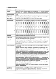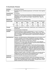 5. Grippe, Influenza Krankheit Virusgrippe, Influenza Erreger Influenza-A-Viren, v.a. H1N1, N3N2; Influenza-B-Viren, v.a. Victoria- und Yama- gata-Linien; ggf. auch neue, pandemische oder Stämme der aviären Influenza Inkubationszeit 1-2 d Diagnostik RT-PCR aus Nasen-/Rachen-Abstrich gegenüber Antigentest zu bevorzugen, Antikörper-Teste in der Akutsituation nicht nützlich Meldepflicht seit Einführung des IfSG (2001) namentliche Labor-Meldepflicht Epidemiologie Deutschland 2001-2018 insgesamt 893.490, in SH insg. 22.526 Meldungen 2001 2002 2003 2004 2005 2006 2007 2008 2009 2010 2011 2012 2013 2014 2015 2016 2017 2018 SH 3.797 1.558 1.482 1.636 2.438 8.816 72 54 332 70 364 174 387 242 99 833 79 93 D 2.493 2.577 8.490 3.496 12.737 3.805 18.906 14.857 3.471 7.511 175.661 43.767 11.575 70.214 77.804 65.852 96.000 274.274 Therapie bei Risikopatienten Neuraminidase-Inhibitoren Prophylaxe Händehygiene, Kontakte meiden; Neuraminidase-Inhibitoren bei Kontakt-Perso- nen zur Prophylaxe nosokomialer Infektionen Impfstoff inaktivierter, quadrivalenter Impfstoff mit aktueller, von der WHO empfohlener Antigenkombination (A: H1N1, H3N2; B: Victoria, Yamagata). Kinder/Jugendli- che von 2-17 Jahren können ersatzweise mit attenuiertem Lebendimpfstoff geimpft werden. Impfindikationen In Schleswig-Holstein besteht eine allgemeine Impfempfehlung für die gesamte Bevölkerung. Jährliche Impfung im Herbst empfohlen. Standardimpfung für Personen ≥ 60. Alle Schwangeren ab 2. Trimenon, bei erhöhter gesundheitlicher Gefährdung infolge eines Grundleidens ab 1. Trimenon. Personen ab 6 Monaten mit erhöhter gesundheitlicher Gefährdung infolge eines Grundleidens; mit angeborener oder erworbener Immundefizienz mit Restfunk- tion bzw. Immunsuppression; HIV-Infektion; in Alters- oder Pflegeheimen. Personen, die als mögliche Infektionsquelle im selben Haushalt lebende oder von ihnen betreute Risikopersonen gefährden können. Berufliche Indikation: Personen mit erhöhter Gefährdung, z. B. medizinisches Personal, in Einrichtungen mit umfangreichem Publikumsverkehr, Personen, die als Infektionsquelle für von ihnen betreute Risikopersonen fungieren können; Personen mit direktem Kontakt zu Geflügel und Wildvögeln. Reiseindikation: für Reisende ab 60 generell empfehlenswert, für andere Rei- sende nach Risikoabwägung sinnvoll. Epidemische Indikation: Wenn eine schwere Epidemie droht und der Impfstoff die neue Variante enthält. Impfquoten keine umfassende Erfassung, ca. 20-30%, steigende Tendenz Bewertung hoch relevante, epidemisch auftretende Krankheit. Steigerung der jährlichen Impfquoten wesentlich, besonders bei Krankenhauspersonal. 5