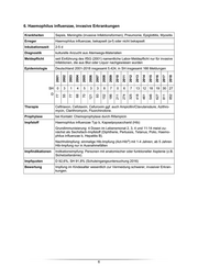 6. Haemophilus influenzae, invasive Erkrankungen Krankheiten Sepsis, Meningitis (invasive Infektionsformen), Pneumonie, Epiglottitis, Myositis Erreger Haemophilus influenzae, bekapselt (a-f) oder nicht bekapselt Inkubationszeit 2-5 d Diagnostik kulturelle Anzucht aus Atemwegs-Materialien Meldepflicht seit Einführung des IfSG (2001) namentliche Labor-Meldepflicht nur für invasive Infektionen, die aus Blut oder Liquor nachgewiesen wurden Epidemiologie Deutschland 2001-2018 insgesamt 5.424, in SH insgesamt 166 Meldungen 2001 2002 2003 2004 2005 2006 2007 2008 2009 2010 2011 2012 2013 2014 2015 2016 2017 2018 SH 0 3 1 4 5 3 3 8 7 0 6 7 13 12 18 19 30 27 D 77 55 77 68 70 121 93 152 186 211 274 325 418 461 546 627 811 852 Therapie Ceftriaxon, Cefotaxim, Cefuroxim ggf. auch Ampicillin/Clavulansäure, Azithro- mycin, Clarithromycin, Fluorchinolone. Prophylaxe bei Kontakt: Chemoprophylaxe durch Rifampicin Impfstoff Haemophilus influenzae Typ b, Kapselpoysaccharid (Hib) Grundimmunisierung: 4 Dosen im Lebensmonat 2, 3, 4 und 11-14 meist zu- nächst als Sechsfach-Impfstoff (Diphtherie, Pertussis, Tetanus, Polio, Haemo- philus influenzae b, Hepatitis B). ® Nachholimpfung: einmalige Hib-Impfung (Act-Hib ) mit 1-4 Jahren; ab 5 Jahren Hib-Impfung nur in Ausnahmefällen Impfindikationen Indikationsimpfung: Personen mit anatomischer oder funktioneller Asplenie (z.B. Sichelzellanämie). Impfquoten D 92,6%, SH 91,8% (Schuleingangsuntersuchung 2016) Bewertung Impfung im Kindesalter wesentlich zur Vermeidung schwerer, invasiver Erkran- kungen. 6