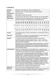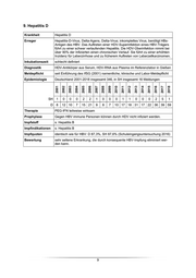 8. Hepatitis B Krankheit Hepatitis B, akute Hepatitis B, Zirrhose, Leberzellkarzinom Erreger Hepatitis-B-Virus, hoch ansteckend bei parenteralen Kontakten Inkubationszeit 60-120 (45-180) d Diagnostik HBs-Antigen, anti-HBc, HBV-Viruslast Meldepflicht seit Einführung des IfSG (2001) namentliche, klinische und Labor-Meldepflicht Epidemiologie Deutschland 2001-2018 insgesamt 28.154, in SH insgesamt 747 Meldungen, seit 2015 nur aufgrund von Laborbefunden, ohne klinische Kriterien 2001 2002 2003 2004 2005 2006 2007 2008 2009 2010 2011 2012 2013 2014 2015 2016 2017 2018 SH 49 33 31 32 27 34 27 25 21 21 24 13 12 16 52 87 105 138 D 2.301 1.424 1.314 1.275 1.238 1.189 1.005 2.026 3.040 3.555 4.508 823 754 770 807 676 693 756 Therapie primär PEG-IFN-alpha; ansonsten nukleosidische und nukleotidische Polymera- se-Inhibitoren Prophylaxe Latex-Produkte zur Prävention der sexuellen Übertragung, sichere Nadeln und Instrumente zur Prävention der Nadelstichverletzung Impfstoff in Hefezellen rekombinant hergestelltes HBs-Antigen, häufig mit HAV Grundimmunisierung: 4 Dosen im Lebensmonat 2, 3, 4 und 11-14 meist zu- nächst als Sechsfach-Impfstoff (Diphtherie, Pertussis, Tetanus, Polio, Haemo- philus influenzae b, Hepatitis B). Bei Personen, die in der Kindheit gegen Hepatitis B geimpft wurden, sollte eine HB-Auffrischimpfung durchgeführt werden, wenn für diese Person ein neu auf- getretenes Hepatitis-B-Risiko besteht (z.B. Aufnahme einer Beschäftigung im Gesundheitsdienst). Anschließend soll eine serologische Kontrolle 4-8 Wochen nach der Impfung erfolgen. Impfindikationen Personen, bei denen wegen einer Immundefizienz bzw. -suppression oder wegen einer vorbestehenden Erkrankung ein schwerer Verlauf einer Hepatitis B zu erwarten ist, z.B. HIV-Positive, HCV-Positive, DialysepatientInnen. Personen mit einem erhöhten nichtberuflichen Expositionsrisiko, z. B. Kontakt zu HBsAg-Trägern in Familie/Wohngemeinschaft, Sexualverhalten mit hohem Infektionsrisiko, i.v.-Drogenkonsumierende, Untersuchungshäftlinge und Straf- gefangene, ggf. PatientInnen psychiatrischer Einrichtungen. Berufliche Indikation: Personen mit erhöhtem beruflichen Expositionsrisiko, ein- schließlich Auszubildende, PraktikantInnen, Studierende und ehrenamtlich Täti- ge mit vergleichbarem Expositionsrisiko, z. B. Personal in medizinischen Ein- richtungen einschließlich Labor- und Reinigungspersonal, Sanitäts- und Ret- tungsdienst, betriebliche ErsthelferInnen, PolizistInnen, Personal von Einrich- tungen, in denen eine erhöhte Prävalenz von Hepatitis-B-Infizierten zu erwarten ist (z. B. Gefängnisse, Asylbewerberheime, Behinderteneinrichtungen). Reiseindikation nach individueller Gefährdungsbeurteilung Impfquoten D 87,3%, SH 87,6% (Schuleingangsuntersuchung 2016) Bewertung konsequente Impfung im Kindesalter wichtig; hohes Potential zur weitgehenden Elimination in Deutschland; relevant für Prävention von Leberkrebs 8