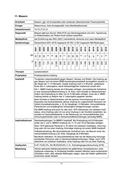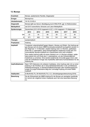 11. Masern Krankheit Masern, ggf. mit Enzephalitis oder subakuter sklerosierender Panenzephalitis Erreger Masernvirus, hohe Kontagiosität, hohe Manifestationsrate Inkubationszeit 13-14 (7-21) d Diagnostik Masern-IgM aus Serum; RNA-PCR aus Atemwegssekret und Urin, Typisierung im Referenzlabor am Robert Koch-Institut wesentlich Meldepflicht seit Einführung des IfSG (2001) namentliche, klinische und Labor-Meldepflicht Epidemiologie Deutschland 2001-2018 insgesamt 25.762, in SH insgesamt 588 Meldungen 2001 2002 2003 2004 2005 2006 2007 2008 2009 2010 2011 2012 2013 2014 2015 2016 2017 2018 SH 23 25 69 14 23 20 28 11 1 43 5 6 7 2 3 41 41 4 11 5 D 6.039 4.656 2.308 1.608 1.768 2.465 777 123 781 566 915 572 780 165 442 325 929 543 Therapie symptomatisch Prophylaxe Postexpositions-Impfung Impfstoff Trivalenter Lebendimpfstoff gegen Masern, Mumps und Röteln. Die Impfung ge- gen Masern soll mit einem MMR-Kombinationsimpfstoff durchgeführt werden, in der Regel bei 11-14 Monaten. Zweite Impfung nach ≥ 4 Wochen, spätestens Ende des 2. Lebensjahrs, damit frühestmöglicher Impfschutz erzielt wird. Die 1. MMR-Impfung bereits ab 9 Monaten erfolgen: bevorstehende Aufnahme in eine Gemeinschaftseinrichtung (z. B. Kita); nach Kontakt zu Masernkranken. Sofern die Erstimpfung im Alter von 9-10 Monaten erfolgte, muss die 2. MMR- Impfung bereits zu Beginn des 2. Lebensjahrs gegeben werden. Nach Kontakt zu Masernkranken soll die passive Immunisierung bis 6 d nach Exposition bei kontraindizierter aktiver Impfung für ungeschützte Personen mit hohem Komplikationsrisiko, z. B. für Säuglinge < 6 Monaten, immundefiziente PatientInnen und empfängliche Schwangere erfolgen/erwogen werden. Die MMR-Impfung wird auch für alle nach 1970 Geborenen mit unklarem Impf- status, ohne Impfung oder mit nur einer Impfung in der Kindheit empfohlen, be- sonders im Gesundheitsdienst, in der Betreuung von Immundefizienten bzw. Immunsupprimierten oder in Gemeinschaftseinrichtungen (einmalig MMR). Impfindikationen Standardimpfungen: 2x MMR/V-Impfstoff. Bei Erstimpfung mit 6-8 Monaten sollen die 2. und 3. MMR/V-Impfung mit 11-14 und 15-23 Monaten erfolgen. Nach 1970 geborene Personen ≥ 18 Jahre mit unklarem Impfstatus, ohne Imp- fung oder mit nur einer Impfung: Einmalige Impfung mit einem MMR-Impfstoff. Indikationsimpfung: Bei bevorstehender Aufnahme bzw. bei Besuch einer Ge- meinschaftseinrichtung (z.B. Kita): Säuglinge ab 9 Monaten. Berufliche Indikation: Im Gesundheitsdienst oder bei der Betreuung immunge- schwächter Personen oder in Gemeinschaftseinrichtungen Tätige: nach 1970 Geborene mit unklarem Impfstatus, ohne Impfung oder mit nur einer Impfung. Impfquoten D 97,1%/92,2%, SH 96,8%/93,6% (1./2.; Schuleingangsuntersuchung 2016) Bewertung Höchst relevante Infektionskrankheit mit gefährlichen Komplikationen; hohe Impfquote notwendig. In Schleswig-Holstein besteht offenbar keine endemische Zirkulation mehr; aber aktuelle Meldungen zeigen, dass die Gefahr gefährlicher Ausbrüche weiter besteht. 11