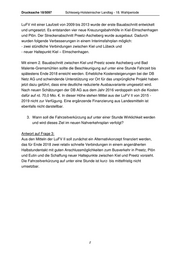 Drucksache 18/5097 Schleswig-Holsteinischer Landtag - 18. Wahlperiode LuFV mit einer Laufzeit von 2009 bis 2013 wurde der erste Bauabschnitt entwickelt und umgesetzt. Es entstanden vier neue Kreuzungsbahnhöfe in Kiel-Elmschenhagen und Plön. Der Streckenabschnitt Preetz-Ascheberg wurde ausgebaut. Dadurch wurden folgende Verbesserungen in einem Interimsfahrplan möglich: - zwei stündliche Verbindungen zwischen Kiel und Lübeck und - neuer Haltepunkt Kiel – Elmschenhagen. Mit einem 2. Bauabschnitt zwischen Kiel und Preetz sowie Ascheberg und Bad Malente-Gremsmühlen sollte die Beschleunigung auf unter eine Stunde Fahrzeit bis spätestens Ende 2018 erreicht werden. Erhebliche Kostensteigerungen bei der DB Netz AG und schwindende Unterstützung vor Ort für das ursprüngliche Projekt haben jetzt dazu geführt, dass eine deutliche reduzierte Ausbauvariante umgesetzt wird. Nach neuen Schätzungen der DB AG aus dem Jahr 2016 verdoppeln sich die Kosten dafür auf rd. 70,0 Mio. €. In dieser Höhe stehen Mittel aus der LuFV II von 2015 - 2019 nicht zur Verfügung. Eine ergänzende Finanzierung aus Landesmitteln ist ebenfalls nicht darstellbar. 3. Wann soll die Fahrzeitverkürzung auf unter einer Stunde Wirklichkeit werden und wird dieses Ziel im neuen Nahverkehrsplan verfolgt? Antwort auf Frage 3: Aus den Mitteln der LuFV II soll zunächst ein Alternativkonzept finanziert werden, das für Ende 2018 zwei relativ schnelle Verbindungen in einem angenäherten Halbstundentakt mit guten Anschlussmöglichkeiten zum Busverkehr in Preetz, Plön und Eutin und die Schaffung neuer Haltepunkte zwischen Kiel und Preetz vorsieht. Die Fahrzeitverkürzung auf unter eine Stunde ist kurz- bis mittelfristig nicht umsetzbar. 2