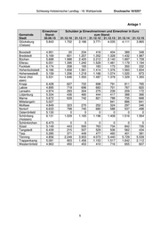 Schleswig-Holsteinischer Landtag - 18. Wahlperiode Drucksache 18/5257 Anlage 1 Einwohner Schulden je Einwohnerinnen und Einwohner in Euro Gemeinde Stand: zum Stand: Stadt 30.06.15 31.12.10 31.12.11 31.12.12 31.12.13 31.12.14 31.12.15 Glücksburg 5.843 1.702 2.186 3.771 4.035 4.111 3.865 (Ostsee) Boostedt 4.951 20 234 416 404 389 348 Bredstedt 5.169 601 1.207 1.352 1.328 1.432 1.987 Büchen 5.688 1.988 2.420 2.212 2.140 1.897 1.728 Ellerau 6.051 1.395 1.240 1.529 1.481 1.179 1.194 Fockbek 6.174 208 193 183 173 350 332 Hohenlockstedt 6.166 1.658 1.561 1.414 1.376 1.563 1.834 Hohenwestedt 5.159 1.206 1.218 1.166 1.074 1.020 973 Horst (Hol- 5.531 1.646 1.550 1.487 1.378 1.329 1.350 stein) Kropp 6.428 627 722 698 791 811 765 Laboe 4.895 719 696 683 701 767 820 Lensahn 4.974 293 304 275 239 209 172 Lütjenburg 5.334 436 460 444 417 388 366 Marne 5.672 639 742 821 788 735 668 Mittelangeln 5.027 941 886 841 Molfsee 4.849 323 270 252 324 297 346 Nortorf 6.633 798 740 680 588 537 498 Osterrönfeld 5.130 0 0 0 0 0 0 Schönberg 6.131 1.029 1.165 1.196 1.408 1.516 1.564 (Holstein) Schönkirchen 6.473 0 0 0 0 0 0 Süsel 5.149 443 593 763 734 842 726 Tangstedt 6.439 215 507 529 506 562 434 Tarp 5.285 371 449 477 460 401 381 Tönning 4.856 2.249 3.933 4.073 5.440 5.729 5.539 Trappenkamp 5.081 903 1.456 1.153 1.517 1.842 2.112 Westerrönfeld 4.963 450 453 410 716 655 607 5