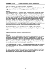 Drucksache 18/ 4122 Schleswig-Holsteinischer Landtag - 18. Wahlperiode 2. Ist eine Änderung des Hochschulgesetzes erforderlich? Wenn ja – wann wird die Landesregierung einen Änderungsgesetz vorlegen, um die angemessenen Fristen des Verfassungsgerichts einhalten zu können? Antwort: Die Landesregierung hat in Erwartung dieser Entscheidung im Rahmen der letzten HSG-Novellierung - anders als andere Länder - bewusst an der ministeriellen Ge- nehmigungspflicht für Studiengänge festgehalten und Regeln zum Verfahren der Ak- kreditierung im schleswig-holsteinischen Hochschulgesetz selbst getroffen (vgl. dazu § 5 Abs. 1 und 2 und §§ 46 und 49 HSG). Die Genehmigung wird unter Berücksichti- gung der Ergebnisse der Akkreditierung erteilt und eröffnet den Hochschulen die Möglichkeit, im Falle der Ablehnung der Einrichtung oder Änderung eines Studien- gangs gegen den formellen Genehmigungsakt den Rechtsweg zu beschreiten. Das schleswig-holsteinische Hochschulgesetz erfüllt daher, anders als in Nordrhein- Westfalen, wesentliche Forderungen des Bundesverfassungsgerichts nach einer ver- fassungskonformen rechtlichen Umsetzung des Akkreditierungsverfahrens. Die Qualitätssicherung durch Akkreditierung wird deshalb an den schleswig- holsteinischen Hochschulen entsprechend den derzeit geltenden Regelungen fortge- setzt. 3. Welche Änderungen sieht die Landesregierung vor? Antwort: Alle Länder nehmen die Entscheidung des Bundesverfassungsgerichts zum Anlass, gemeinsam die Entscheidungsgründe eingehend zu analysieren und möglichen Handlungsbedarf sowohl in Bezug auf die gemeinsamen Rechtsgrundlagen der Ak- kreditierung in Deutschland als auch in den einzelnen Ländern sorgfältig zu prüfen. Schleswig-Holstein wird sich daran beteiligen und mögliche Konsequenzen für das schleswig-holsteinische Hochschulgesetz berücksichtigen. Die Länder werden am 12. Mai d. J. auf der Amtschefkonferenz über das Urteil bera- ten. Ebenso diskutierte der Akkreditierungsrat am 26.04.2016 auf einer Sondersit- zung das Thema. Da dieser Prozess noch am Anfang steht, kann zum jetzigen Zeitpunkt keine Aussa- ge darüber getroffen werden, ob und ggf. welcher Änderungsbedarf für das schles- wig-holsteinischen Hochschulgesetz erforderlich werden könnte. 2