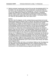 Drucksache 18/2707 Schleswig-Holsteinischer Landtag - 18. Wahlperiode 2. Welche konkreten Auswirkungen wird die Kürzung des Haushaltstitels 883 07 im Einzelplan 6 für das Haushaltsjahr 2015 „Zuweisungen aus Bundesmitteln für den kommunalen Straßenbau (ohne Radwegebau)“ aus Sicht der Landesregie- rung auf den allgemeinen Zustand der kommunalen Straßen in Schleswig- Holstein haben? Liegen der Landesregierung überhaupt konkrete Kenntnisse über den allgemeinen Zustand der kommunalen Straßen in Schleswig-Holstein vor? Wenn ja, bitte darstellen. Wenn nein, warum nicht? Antwort: Das durch das Grundgesetz und die Landesverfassung garantierte kommunale Selbstverwaltungsrecht bedeutet, dass im Rahmen des eigenen Wirkungskreises die Aufgaben unabhängig und eigenverantwortlich wahrgenommen werden. Selbstverwaltung umfasst als Teil der Daseinsvorsorge auch das Vorhalten einer funktionsfähigen Straßenverkehrsinfrastruktur und die hiermit einhergehende Fi- nanzverantwortung der Kommunen. Nicht erst mit dem Bericht der Daehre- Kommission zur „Zukunft der Verkehrsinfrastrukturfinanzierung“ ist hinlänglich bekannt, dass über alle Verkehrs- und Baulastträger hinweg der Erhaltungs- und Nachholbedarf immens hoch ist. Allein beim Verkehrsträger Straße besteht ba- sierend auf den Zahlen für das Jahr 2012 bundesweit eine jährliche Unterfinan- zierung von 4,7 Milliarden Euro. Mit den genannten Zuweisungen des Bundes als Grundlage der GVFG-SH-Förderung unterstützt das Land die Kommunen bei ih- rer Aufgabenerfüllung als Straßenbaulastträger. Durch die unter der Maßgabe „Erhalt vor Neubau“ vorgenommene Priorisierung von Sanierungsvorhaben beim Einsatz dieser Mittel stellt die Landesregierung sicher, dass die Förderung kom- munaler Erhaltungsmaßnahmen auch in 2015 auf dem hohen Niveau der letzten Jahre fortgesetzt wird. Darüber hinaus erhalten die Kreise und kreisfreien Städte auf der Grundlage des neu gefassten Finanzausgleichsgesetzes ab 2015 zusätzliche Mittel für Infra- strukturlasten in Höhe von jährlich 11,5 Mio. €, die in kommunaler Eigenverant- wortung auch für die Straßenerhaltung eingesetzt werden können. 2