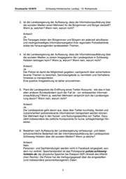 Drucksache 18/4670 Schleswig-Holsteinischer Landtag - 18. Wahlperiode 3. Ist die Landesregierung der Auffassung, dass die Informationsaufklärung über die sozialen Medien einen Mehrwert für die Bürgerinnen und Bürger darstellt? Wenn ja, welchen? Wenn nein, warum nicht? Antwort: Ja. Die Fanpages bieten den Bürgerinnen und Bürgern ein jederzeit abrufbares und niedrigschwelliges Informationsangebot ihrer regionalen Polizeibehörde sowie bei herausragenden landesweiten Themen. 4. Ist die Landesregierung der Auffassung, dass die Informationsaufklärung über die sozialen Medien zu einem Imagegewinn der Landespolizei in Schleswig- Holstein beitragen kann? Wenn ja, warum? Wenn nein, warum nicht? Antwort: Ja. Der Polizei ist damit die Möglichkeit gegeben, sachgerecht über sicherheitsre- levante Themen zu berichten, Serviceangebote zu vermitteln und Verhaltens- hinweise zu transportieren. Eine positive Imagewirkung ist daher anzunehmen. 5. Plant die Landespolizei die Eröffnung eines Twitter-Accounts - wie das in fast allen anderen Bundesländern auch der Fall ist - zur verbesserten Informati- onsaufklärung? Wenn ja, welchen Mehrwert verspricht sich die Landesregie- rung davon? Wenn nein, warum nicht? Antwort: Ja. Die Landespolizei geht davon aus, dass über Twitter kurzfristig, flexibel und nutzerorientiert polizeirelevante Informationen transportiert werden können. Der Mehrwert liegt in den Nutzer- und Nutzungsspezifika von Twitter. Dazu zählt insbesondere die zeitliche Komponente für kurze, schlaglichtartige Hin- weise. 6. Bestehen nach Auffassung der Landesregierung verfassungs- und daten- schutzrechtliche Bedenken bei der Informationsaufklärung der Landespolizei Schleswig-Holstein über die sozialen Medien? Wenn ja welche? Antwort: Nein. Personen- und Sachfahndungen werden nicht in Facebook eingespielt, son- dern nur verlinkt. Speicherstandort ist das Polizeiportal polizei.schleswig- holstein.de, der physische Speicher bei Dataport AöR (Anstalt des öffentli- chen Rechts). Die Polizei hat die Verfügungsgewalt über die eingestellten (und insbesondere personenbezogenen) Daten. 2