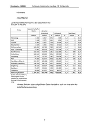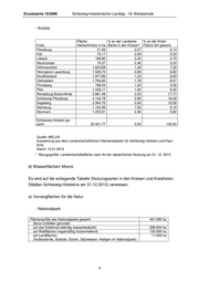 Drucksache 18/2696 Schleswig-Holsteinischer Landtag - 18. Wahlperiode - Knicks Fläche % an der Landwirts- % an der Knick- Kreis Hecke/Knicks in ha fläche in den Kreisen* Fläche SH-gesamt Flensburg 31,05 2,07 0,14 Kiel 73,17 2,06 0,33 Lübeck 168,80 2,42 0,75 Neumünster 74,37 2,46 0,33 Dithmarschen 1.623,68 1,49 7,25 Herzogtum Lauenburg 1.526,73 2,08 6,82 Nordfriesland 1.977,89 1,23 8,83 Ostholstein 1.794,65 1,78 8,01 Pinneberg 796,04 1,93 3,55 Plön 1.439,11 1,94 6,42 Rendsburg-Eckernförde 3.981,48 2,53 17,77 Schleswig-Flensburg 4.142,78 2,65 18,49 Segeberg 2.364,75 2,65 10,56 Steinburg 1.153,36 1,50 5,15 Stormarn 1.253,91 2,46 5,60 Schleswig-Holstein ge- samt 22.401,77 2,02 100,00 Quelle: MELUR Auswertung aus dem Landwirtschaftlichen Flächenkataster für Schleswig-Holstein und Ham- burg Stand: 12.01.2015 * Bezugsgröße: Landwirtschaftsfläche nach Art der tatsächlichen Nutzung am 31. 12. 2013 d) Wasserflächen/ Moore Es wird auf die anliegende Tabelle (Nutzungsarten in den Kreisen und Kreisfreien Städten Schleswig-Holsteins am 31.12.2013) verwiesen. e) Vorrangflächen für die Natur - Nationalpark Flächengröße des Nationalparks gesamt: 441.000 ha davon entfallen gerundet auf das Sublitoral (ständig wasserbedeckt): 299.500 ha auf Wattflächen (regelmäßig trockenfallend) 130.000 ha auf Landflächen 11.500 ha (Außensände, Strände, Dünen, Salzwiesen, Halligen im Nationalpark) 4