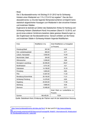 - Wald Die 3. Bundeswaldinventur mit Stichtag 01.01.2012 hat für Schleswig- 1 Holstein einen Waldanteil von 11% (173.412 ha) ergeben . Das der Bun- deswaldinventur zu Grunde liegende Stichprobenverfahren ermöglicht keine statistisch abgesicherten Aussagen zum Waldanteil in den einzelnen Kreisen und kreisfreien Städten. Ergänzend ist deshalb auf Zahlen des Statistischen Amtes für Hamburg und Schleswig-Holstein (Statistikamt Nord) hinzuweisen (Stand 31.12.2013); auf- grund eines anderen Verfahrens bestehen dabei gewisse Abweichungen zu den Ergebnissen der Bundeswaldinventur. Danach entfallen auf die Kreise und kreisfreien Städte in Schleswig-Holstein folgende Waldflächen: Kreis Waldfläche in ha Anteil Waldflächen zu Kreisgebiet (in Prozent) Flensburg/Stadt 357,00 6,29 Kiel, Landeshauptstadt 683,00 5,77 Lübeck, Hansestadt 3.092,00 14,49 Neumünster, Stadt 324,00 4,52 Dithmarschen 5.306,00 3,68 Herzogtum Lauenburg 32.406,00 25,67 Nordfriesland 8.751,00 4,21 Ostholstein 14.158,00 10,18 Pinneberg 5.855,00 8,85 Plön 12.267,00 11,33 Rendsburg-Eckernförde 25.150,00 11,51 Schleswig-Flensburg 14.378,00 6,95 Segeberg 23.323,00 17,36 Steinburg 9.880,00 9,36 Stormarn 10.495,00 13,71 Anteil Wald zur Landesfläche (in Prozent) Summe 166.425,00 10,54 Quelle: Statistikamt Nord, Erhebung der Flächen nach Art der tatsächlichen Nutzung 1 https://www.bundeswaldinventur.de/index.php?id=2, für das Land S-H http://www.schleswig- hol- stein.de/UmweltLandwirtschaft/DE/NaturschutzForstJagd/06_Wald/01_Informationen/03_Waldzustand /02_Bundeswaldinventur/ein_node.html 3