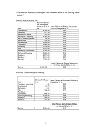 - Flächen von Naturschutzstiftungen und -vereinen wie z.B. der Stiftung Natur- schutz? Stiftung Naturschutz S.-H.: Eigentum/Besitz der Stiftung Na- turschutz S.-H. in Anteil Flächen der Stiftung Naturschutz Kreis ha S.-H. zu Kreisgebiet (in %) Dithmarschen 5.191,00 3,60 Flensburg 117,00 2,06 Hansestadt Lübeck 322,00 1,51 Herzogtum Lauenburg 1.762,00 1,40 Kiel (Landeshauptstadt) 26,00 0,22 Neumünster 228,00 3,18 Nordfriesland 2.548,00 1,22 Ostholstein 3.084,00 2,22 Pinneberg 1.336,00 2,02 Plön 2.018,00 1,86 Rendsburg-Eckernförde 3.744,00 1,71 Schleswig-Flensburg 6.606,00 3,19 Segeberg 2.076,00 1,55 Steinburg 2.710,00 2,57 Stormarn 1.101,00 1,44 Anteil Flächen der Stiftung Naturschutz S.-H. zur Landesfläche (in %) Summe 32.869,00 2,08 Kurt und Erika Schrobach-Stiftung: Schrobach-Stiftung Anteil Flächen der Schrobach-Stiftung zu Kreis in ha Kreisgebiet (in %) Herzogtum Lauenburg 1,50 0,00 Nordfriesland 12,70 0,01 Ostholstein 2,91 0,00 Plön 188,90 0,17 Rendsburg- Eckernförde 595,44 0,27 Schleswig-Flensburg 1.200,45 0,58 Segeberg 188,65 0,14 Steinburg 174,09 0,16 Anteil Flächen der Schrobach-Stiftung zur Landesfläche (in %) Summe 2.364,66 0,15 7
