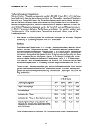 Drucksache 19/1338 Schleswig-Holsteinischer Landtag - 19. Wahlperiode Vorbemerkung der Fragestellerin Mit dem Ersten Pflegestärkungsgesetz wurde § 84 SGB XI zum 01.01.2015 dahinge- hend geändert, dass bei Vereinbarungen über die Pflegesätze zwischen Pflegeheim- betreiber und Sozialhilfeträgern die Bezahlung tarifvertraglich vereinbarter Vergütun- gen an die Beschäftigten sowie entsprechender Vergütungen nach kirchlichen Ar- beitsrechtsregelungen nicht mehr als unwirtschaftlich abgelehnt werden durften. Mit dem Dritten Pflegestärkungsgesetz wurde die Vorschrift auch auf Pflegeheime zum 01.01.2017 erweitert, die keiner Tarifbindung unterliegen. Hier werden seitdem auch Vergütungen in Höhe vergleichbarer Tarifverträge anerkannt. Hierzu frage ich die Landesregierung: 1. Wie haben sich die Ausgaben für stationäre Leistungen der sozialen Pflegever- sicherung in Schleswig-Holstein seit 2014 entwickelt? Antwort: Statistiken der Pflegekassen, u. a. zu den Leistungsausgaben, werden viertel- jährlich von den Pflegekassen erstellt. Die Statistiken werden insbesondere von den bundesunmittelbaren Pflegekassen (z. B. Ersatzkassen, Betriebskran- kenkassen, Innungskrankenkassen) nicht länderbezogen aufbereitet, so dass keine Landeszahlen zur Verfügung stehen. In Schleswig-Holstein gibt es der- zeit auch keine landesunmittelbaren Pflegekassen mehr, d. h. Pflegekassen, über die das Land Schleswig-Holstein die Aufsicht führt. Entsprechende Daten einzelner Pflegekassen in Schleswig-Holstein liegen daher ebenfalls nicht vor. Daten zu den Leistungsausgaben gibt es nur als Bundesstatistik. Nach den An- gaben des Bundesministeriums für Gesundheit haben sich die Leistungsaus- gaben der sozialen Pflegeversicherung für stationäre Leistungen seit 2014 wie folgt entwickelt: Jahr/ in Mrd. Euro Leistungsausgaben 2014 2015 2016 2017 Tages-/Nachtpflege 0,31 0,41 0,52 0,68 Kurzzeitpflege 0,43 0,50 0,57 0,60 Vollstationäre Pflege 10,26 10,74 10,91 13,00 Vollstationäre Pflege in Behindertenheimen 0,27 0,28 0,29 0,40 Vergütungszuschläge für zusätzliche Be- 0,63 1,03 1,23 1,31 treuung und Aktivierung in stationären Pfle- geeinrichtungen Quelle: Bundesministerium für Gesundheit, Die Finanzentwicklung der sozialen Pflegeversicherung 2