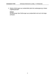 Drucksache 19/122 Schleswig-Holsteinischer Landtag - 19. Wahlperiode 4. Welche Zuführungen aus Landesmitteln plant die Landesregierung in dieser Legislaturperiode? Antwort: Die Beratungen über Zuführungen aus Landesmitteln sind noch nicht abge- schlossen. 2