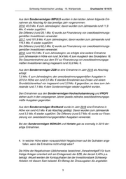 Schleswig-Holsteinischer Landtag - 19. Wahlperiode Drucksache 19/1670 Aus dem Sondervermögen IMPULS wurden in den letzten Jahren folgende Ent- nahmen als Abschlag für das jeweilige Jahr vorgenommen: 2016: 40,0 Mio. € zum Jahresbeginn; davon wurden zum Jahresende rund 11,9 Mio. € wieder zugeführt. Die Differenz (rund 28,1 Mio. €) wurde zur Finanzierung von zweckbestimmungs- gemäßen Investitionen verwendet. 2017: rund 181,9 Mio. € zum Jahresbeginn; davon wurden zum Jahresende rund 119,5 Mio. € wieder zugeführt. Die Differenz (rund 62,5 Mio. €) wurde zur Finanzierung von zweckbestimmungs- gemäßen Investitionen verwendet. 2018: rund 19,5 Mio. € zum Jahresbeginn; es erfolgte eine weitere Entnahme zum Jahresende in Höhe von rund 34,4 Mio. € zum Ausgleich des Einzelplans 16. Die Gesamtentnahme aus dem SV zur Finanzierung von zweckbestimmungsge- mäßen Investitionen betrug insgesamt rund 53,8 Mio. €. Aus dem Sondervermögen ZGB ist eine Entnahme im Jahr 2018 als Abschlag erfolgt: 7,5 Mio. € zum Jahresbeginn; den zweckbestimmungsgemäßen Ausgaben in 2018 in Höhe von rund 3,9 Mio. € standen Einnahmen aus Zinsen und einem Grundstücksverkauf von insgesamt rund 3,5 Mio. € gegenüber, so dass zum Jah- resende rund 7,1 Mio. € dem Sondervermögen wieder zugeführt wurden. Den Entnahmen aus den Sondervermögen Hochschulsanierung und PROFI stehen auch in den vergangenen Jahren jeweils zeitnahe zweckbestimmungsge- mäße Ausgaben gegenüber. Aus dem Sondervermögen Breitband wurde im Jahr 2018 eine Entnahme in Höhe von rund 4,0 Mio. € als Abschlag getätigt. Davon wurden zum Jahresende rund 3,3 Mio. € wieder zugeführt. Die Differenz (rund 0,7 Mio. €) wurde zur Finan- zierung von zweckbestimmungsgemäßen Ausgaben verwendet. Bei den Sondervermögen MOIN.SH und Verkehr gab es erstmalig in 2019 der- artige Entnahmen. 4. In welcher Höhe wären voraussichtlich Negativzinsen auf die Guthaben ange- fallen, wenn die Entnahme nicht erfolgt wäre? Die Höhe der Negativzinsen (üblicherweise bezeichnet „Verwahrentgelt“) für kurz- fristige Anlagen orientiert sich am Einlagensatz der EZB, der derzeit 0,40% p.a. beträgt. Aktuell werden die Kontoguthaben bei der Investitionsbank Schleswig- Holstein mit diesem Satz belastet. Ein Betrag der Zinsausgaben die angefallen 3
