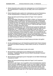 Drucksache 18/579 Schleswig-Holsteinischer Landtag - 18. Wahlperiode 2. Welche Gespräche gab es seitens der Landesregierung vor der Entscheidung mit den Verantwortlichen in Flensburg (z.B. der Stadt), wann und mit welchem Er- gebnis? 3. Welche Gespräche gab es seitens der Landesregierung nach der Entscheidung mit den Verantwortlichen in Flensburg, wann und mit welchem Ergebnis? Wegen des Sachzusammenhangs werden die Fragen 1 bis 3 zusammen beantwortet: Mit der vierstreifigen Osttangente von der B200 im Süden von Flensburg bis zum Schottweg im östlichen Stadtbereich Flensburgs ist eine große Entlastung des Innenstadtbereiches erreicht worden. Die Verkehrsbelastungen im anschließen- den Bereich der B199, die gemäß der letzten bundesweiten Straßenverkehrszäh- lung in 2010 zwischen rd. 17.450 Kfz/24h und rd. 10.500 Kfz/24h liegen, können verkehrlich verträglich abgewickelt werden. Da unter Berücksichtigung der in den Vorbemerkungen genannten Aspekte, der bestehenden Verekehrsbelastungen und des bislang ermittelten Kosten-Nutzen- Verhältnisses von 1,1 (BVWP 2003) ein vierstreifiger Ausbau der B199 von Flensburg/O bis Wees in einem überschaubaren Zeitraum nicht realistisch ist, soll von einer Anmeldung der Strecke abgesehen werden. Auch die gemäß der der- zeit gültigen Bedarfsplanprognose für das Jahr 2025 prognostizierten Verkehrsbe- lastungen, die etwas niedriger ausfallen, erlauben keine andere Bewertung. Im Übrigen ist ein weiterer vierstreifiger Ausbau der B199 im Mobilitätsprogramm der Stadt Flensburg von 2005 auch nicht enthalten. Gespräche mit Verantwortlichen der Stadt Flensburg sind daher nicht geführt worden. 4. Hat die Landesregierung vor der Entscheidung aktuelle Kosten-Nutzen-Analysen hinsichtlich der Strecke Flensburg/ O-Wees erstellt und wenn ja, mit welchem Er- gebnis? Antwort: Aktuelle Kosten-Nutzen-Analysen wurden nicht erstellt. 5. Wie beurteilt die Landesregierung eine Verlängerung der 4-Spurigkeit vom Schottweg / Trögelbsbyer Weg bei Famila bis Abfahrt Glücksburger Chaussee/ Gemeindegrenze Wees? 6. Wie beurteilt die Landesregierung eine 4-Spurigkeit von der Abfahrt Glücksburger Chaussee bis Oxbüll? Wegen des Sachzusammenhangs werden die Fragen 5 und 6 zusammen beantwortet: Wie schon zu den Fragen 1 bis 3 ausgeführt, können die bestehenden Verkehrs- ströme verkehrlich abgewickelt werden, so dass von einem stabilen Verkehrszu- stand auszugehen ist. Ein vierstreifiger Ausbau würde die Qualität des Verkehrs- ablaufs dahingehend verbessern, dass ein freier Verkehrsfluss besteht. Unter wirtschaftlichen Aspekten ist es allerdings ausreichend, wenn auch niedrigere Qualitätsstufen erreicht werden wie z.B. der, dass der Verkehrszustand noch sta- 2