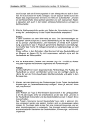 Drucksache 18/1720 Schleswig-Holsteinischer Landtag - 18. Wahlperiode ses Konzept stellt die Erinnerungsarbeit in den Mittelpunkt und soll im Som- mer 2014 als Entwurf im MJKE vorliegen. Es soll ergänzt werden durch den Aspekt des zeitgenössischen Erinnerns mit Hilfe von authentischen Lernorten wie der Neulandhalle. Diese politisch gewollten und sich ergänzenden Aspek- te spiegelten sich auch in den beiden schleswig-holsteinischen Anträgen an den Bund wider. 3. Welche Ablehnungsgründe wurden von Seiten der Kommission zum Förder- antrag der Landesregierung für das Projekt Neulandhalle angegeben? Antwort: In dem Schreiben aus dem BKM heißt es dazu: Die Sachverständigen be- mängelten beim Konzept die zu starke Überfremdung und die Reauratisierung bei zu geringer Originalsubstanz: „Der historische Ort werde durch Zuschrei- bung angereichert. Das in Anspruch genommene didaktische Alleinstellungs- merkmal für das Thema NS-Volksgemeinschaft und Lebensideologie sei nicht gegeben.“ Weiter heißt es in dem Schreiben: „Das Gremium hält eine Gedenkstätte und ein Museum an diesem Ort für nicht angemessen, vielmehr eigne sich die Neulandhalle als Bildungsstätte.“ 4. War der Aufbau eines „Gedenk- und Lernortes“ (Vgl. Drs. 18/1596) zur Förde- rung des Projektes Neulandhalle Gegenstand des Förderantrages? Antwort: Die Baumaßnahmen waren Gegenstand des Förderantrags. Der Ausbau der Neulandhalle zu einem vermittelnden Lernort war ein wichtiger Aspekt zu- nächst der von der Kirche beauftragten Machbarkeitsstudie und später in dem Bundesantrag. 5. Werden nach der Ablehnung des Förderantrages für das Projekt Neulandhalle Anpassungen im Gedenkstättenkonzept erfolgen? Wenn ja, welche? Wenn nein, warum nicht? Antwort: Siehe Antwort auf Frage 2. Wie Ministerin Spoorendonk in der Landtagsdebat- te am 19.März sagte, ist für sie entscheidend, an der Idee eines Lernortes in der Neulandhalle festzuhalten und das Gedenkstättenkonzept in diesem Sinne fortzuschreiben. Das Projekt „Historischer Lernort Neulandhalle“ kann nicht in gleichem Um- fang umgesetzt werden wie geplant. Insofern wird es Anpassungen geben müssen. Im Grundsatz bleibt es das Ziel, eine moderne Erinnerungs- und vor allem Vermittlungsarbeit zu entwickeln. Das Konzept besteht entsprechend aus verschiedenen Bausteinen der Gedenkstätten-, Erinnerungs-, und Vermitt- lungsarbeit. 2