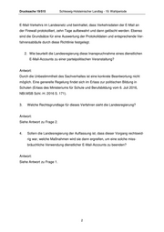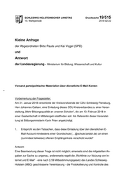 SCHLESWIG-HOLSTEINISCHER LANDTAG Drucksache 19/515 19. Wahlperiode 2018-02-22 Kleine Anfrage der Abgeordneten Birte Pauls und Kai Vogel (SPD) und Antwort der Landesregierung - Ministerium für Bildung, Wissenschaft und Kultur Versand parteipolitischer Materialien über dienstliche E-Mail-Konten Vorbemerkung der Fragesteller: Am 31. Januar 2018 verschickte der Kreisvorsitzende der CDU Schleswig-Flensburg, Herr Johannes Callsen, eine Einladung dieses CDU-Kreisverbandes zu einer Veran- staltung „Mehr Bildungsqualität an unseren Schulen“, die am 13. Februar 2018 in einer Gastwirtschaft in Mittelangeln stattfinden soll. Als Referentin dieser Veranstal- tung ist Bildungsministerin Karin Prien angekündigt. 1. Entspricht es den Tatsachen, dass diese Einladung über den dienstlichen E- Mail-Account mindestens einer Grundschule (…@schule.landsh.de) an einen (zumindest teilweise) offenen Empfängerkreis verschickt wurde? Antwort: Eine Beantwortung dieser Frage ist nicht möglich; einerseits sind die mitgeteilten An- gaben zur Sache zu ungenau, andererseits regelt die „Richtlinie zur Nutzung von In- ternet und E-Mail“ - eine nach § 59 Mitbestimmungsgesetz des Landes Schleswig- Holstein (MBG) geschlossene Vereinbarung - die Protokollierung und Kontrolle des