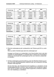 Drucksache 18/957 Schleswig-Holsteinischer Landtag - 18. Wahlperiode 2005 2006 2007 Finanzierung T€ Anteil T€ Anteil T€ Anteil Eigenmittel 3.518,34 45% 3.782,52 45% 2.776,59 32% Bundesmittel 1.311,33 17% 1.581,12 19% 1.788,62 20% Landesmittel 0,00 0% 1.280,00 15% 50,00 1% ESF-Mittel 3.070,00 39% 1.800,00 21% 3.030,00 35% Gesamtkosten 7.899,67 8.443,64 8.742,20 2008 2009 2010 Finanzierung T€ Anteil T€ Anteil T€ Anteil Eigenmittel 4.058,51 45% 4.070,72 45% 4.095,98 45% Bundesmittel 1.819,90 20% 1.878,62 21% 1.979,11 22% Landesmittel 1.380,00 15% 1.380,00 15% 1.380,00 15% ESF-Mittel 1.700,00 19% 1.700,00 19% 1.700,00 19% Gesamtkosten 8.958,41 9.029,34 9.155,09 2011 2012 2013 Finanzierung T€ Anteil T€ Anteil T€ Anteil Eigenmittel 3.767,13 43% 5.247,91 49% 4.937,98 49% Bundesmittel 1.856,71 21% 2.339,33 22% 2.125,34 21% Landesmittel 1.125,00 13% 1.125,00 11% 1.125,00 11% ESF-Mittel 1.955,00 22% 1.955,00 18% 1.955,00 19% Gesamtkosten 8.703,84 10.667,24 10.143,32 3. Plant die Landesregierung den Landesanteil an der Förderung ab 2014 zu verän- dern? Wenn ja, welche Veränderungen plant die Landesregierung? Aussagen zum Einsatz von Landesmitteln in der Zukunft stehen immer unter dem Vorbehalt von Notwendigkeiten zu Veränderungen im Rahmen der Haushaltskon- solidierung. Derzeit plant die Landesregierung nicht, den Anteil der Landesmittel zu verändern. 4. Teilt die Landesregierung die Einschätzung, dass die öffentliche Förderung auch dazu führt, dass Handwerksbetriebe zusätzliche, ggf. auch schwächere Lehrlinge einstellen? Bitte begründen. Die ÜLU dient dazu, die Unternehmen bei der Ausbildung zu unterstützen und die Ausbildungsbereitschaft zu erhöhen. Davon profitieren auch schwächere Jugend- liche. Die ÜLU ist jedoch nicht speziell darauf ausgerichtet, schwächere Jugendli- che in der Ausbildung zu unterstützen. 2