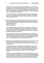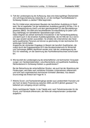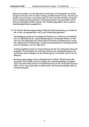 Drucksache 18/957 Schleswig-Holsteinischer Landtag - 18. Wahlperiode bildung dort ergänzt, wo die geforderten Kenntnisse und Fertigkeiten am Ausbil- dungsort nicht oder nicht im vollen Umfang vermittelt werden können. Mit der ÜLU werden die technischen Voraussetzungen für eine zukunftsorientierte und qualifi- zierte Ausbildung flächendeckend in Schleswig-Holstein erst geschaffen. Mit ihr wird ein potentielles Gefälle zwischen der Ausbildungsqualität in den einzelnen Ausbildungsbetrieben ausgeglichen. 10. Auf welcher Bemessungsgrundlage erfolgt eine Bezuschussung aus Landesmit- teln zu den Lehrgangskosten und zu den Unterbringungskosten? Die Bewilligung erfolgt auf Grundlage der Richtlinie zur Förderung von Maßnah- men zur Bekämpfung der Jugendarbeitslosigkeit in Schleswig-Holstein im Rah- men des Zukunftsprogramms Arbeit (Rahmenrichtlinie Prioritätsachse B) sowie den ergänzenden Förderkriterien „Förderung überbetriebliche Lehrlingsunterwei- sung im Handwerk“ vom 22. März 2010. Zuwendungsfähig sind die im Zusammenhang mit der ÜLU stehenden Personal- ausgaben, Sachausgaben der Lehrlingsunterweisung, lehrgangsbezogene Ge- meinkosten sowie Ausgaben für die Unterbringung in Internaten und für die Ver- pflegung. Bemessungsgrundlage ist die je Doppelstunde ermittelte Teilnehmerstunden- pauschale, die ab 2008 auf der Grundlage der zuwendungsfähigen Ausgaben durch das Heinz-Piest-Institut für Handwerkstechnik an der Universität Hannover (HPI) in Form eines Gutachten ermittelt wurde. Die Pauschale beträgt 8,56 € je Teilnehmerstunde. 6