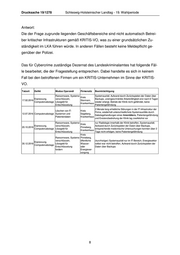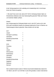 Drucksache 19/1278 Schleswig-Holsteinischer Landtag - 19. Wahlperiode ist der Verfassungsschutz nicht zuständig und er beabsichtigt nicht, in die Kompe- tenzen der Polizei einzugreifen. 1. Wie viele Firmen sind in den Jahren 2017-2018 in Schleswig-Holstein Opfer von Schadsoftware (Malware) oder eines Hackerangriffes geworden? Bitte nach Kreisen und kreisfreien Städten auflisten. Antwort: Dem Verfassungsschutz Schleswig-Holstein sind im Jahr 2017 sechs und im Jahr 2018 zwölf mutmaßliche Angriffe auf schleswig-holsteinische Firmen im Rahmen von Cyberkampagnen bekannt geworden. Diese verteilen sich wie folgt: 2017: Lübeck 1 Herzogtum Lauenburg 1 Ostholstein 1 Rendsburg-Eckernförde 1 Segeberg 2 2018: Flensburg 1 Kiel 1 Lübeck 2 Dithmarschen 1 Nordfriesland 1 Ostholstein 1 Pinneberg 1 Rendsburg-Eckernförde 1 Segeberg 1 Steinburg 1 Stormarn 1 Dem Landeskriminalamt wurden im Rahmen des Sondermeldedienstes Cybercrime 161 Fälle im Jahr 2017 und 128 Fälle im Jahr 2018 gemeldet, in denen Unternehmen 2