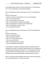 Schleswig-Holsteinischer Landtag - 19. Wahlperiode Drucksache 19/1278 als Geschädigte erfasst worden sind. Bei dem Großteil dieser 161 Fälle handelt es sich um von der Fragestellung nicht erfasste Betrugsdelikte. Die für die Fragestellung relevanten Fälle lassen sich für 2017 wie folgt differenzie- ren: 28 Fälle von Ransomware 11 Fälle durch Versand von Spam-Mails mit Link zu einer Schadsoftware 7 Fälle von Account-Übernahmen 4 Fälle von DDoS-Angriffen mit Erpressung 2 Fälle von DDoS-Angriffen als bloße Computersabotage 2 Fälle von Schadsoftware für das Mining von Kryptowährungen 2 Fälle von Schadsoftware unbekannten Typs 1 Fall von Webseiten-Defacement. Die für die Fragestellung relevanten Fälle lassen sich für 2018 wie folgt differenzie- ren: 20 Fälle von Ransomware 7 Fälle von Account-Übernahmen 3 Fälle von Webseiten-Defacement 4 Fälle von um Telefonanlagen-Hacking 1 Fall von einem DDoS-Angriff 8 Fälle von Datenerpressung nach Hacking 1 Fall von unberechtigten Systemzugriffen Da die Falldaten nicht statistisch aufbereitet vorliegen, kann die gewünschte Auf- schlüsselung nach Kreisen und Kreisfreien Städten lediglich für die unmittelbar beim Landeskriminalamt bearbeiteten Fälle erfolgen. Für eine vollständige Aufschlüsse- lung aller Fälle wäre eine Einzelauswertung in Form einer Einsichtnahme und voll- ständigen Durchsicht eines jeden betroffenen Ermittlungsvorgangs erforderlich. Bei den im Landeskriminalamt bearbeiteten Fällen stellt sich die Verteilung differen- ziert nach Modus Operandi und Firmensitz wie folgt dar: 3