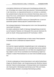Schleswig-Holsteinischer Landtag - 19. Wahlperiode Drucksache 19/1278 unverzüglichen Maßnahmen die Fortsetzung der Verschlüsselung verhindern kön- nen. Viel wichtiger sind in diesem Kontext aber präventive IT-Sicherheitsmaßnahmen in den Unternehmen, um entsprechende Szenarien von vornherein zu unterbinden. Das Landeskriminalamt verfügt über keine verifizierten Erkenntnisse, dass es sich in diesem Fall um eine „nordkoreanische“ Hacker-Software gehandelt hat, zumal primär ein Ransomware-Angriff vorlag. Eine Statistik über den staatlichen Ursprung von Cyberangriffen bzw. zu einer ent- sprechenden globalen Verteilung liegt dem Landeskriminalamt nicht vor. Dem schleswig-holsteinischen Verfassungsschutz ist der in dem Zeitungsartikel ge- nannte Angriff nicht bekannt. Die meisten ausländischen Angriffe mit Spionage-/Sabotagehintergrund stammen aus der Russischen Föderation, der Volksrepublik China sowie der Islamischen Re- publik Iran (Quelle: Verfassungsschutzbericht 2017 des Bundes, S. 269 ff.). 4. Wie viele Fälle von Lösegeldzahlungen an Hacker zwecks Freikauf gesperrter Firmendaten sind der Landesregierung insgesamt bekannt? Antwort: Die Anzahl der insgesamt geleisteten Lösegeldzahlungen ist der Landesregierung nicht bekannt. In den bei dem für Cybercrime zuständigen Dezernat des Landeskri- minalamtes bearbeiteten Strafverfahren ist in drei Fällen eine Lösegeldzahlung er- folgt, lediglich in einem Fall war anschließend eine Entschlüsselung möglich bzw. erfolgreich. In diesem Phänomenbereich ist von einem hohen Dunkelfeld auszuge- hen. 5. Sind der Landesregierung Vorkommnisse bekannt, durch welche Krankenhäuser, Anlagen der öffentliche Wasser- oder Energieversorgung oder öffentlichen Zwecken dienenden Telekommunikationsanlagen in Schleswig-Holstein durch Schadsoftware oder Hackerangriffe im Betriebsablauf beeinträchtigt wurden? Bitte nach Kreisen, kreisfreien Städten, Betreibern und jeweiliger Beeinträchtigung auflisten. 7