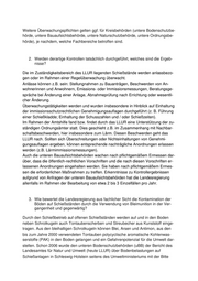 Weitere Überwachungspflichten gelten ggf. für Kreisbehörden (untere Bodenschutzbe- hörde, untere Bauaufsichtsbehörde, untere Naturschutzbehörde, untere Ordnungsbe- hörde), je nachdem, welche Fachbereiche betroffen sind. 2. Werden derartige Kontrollen tatsächlich durchgeführt, welches sind die Ergeb- nisse? Die im Zuständigkeitsbereich des LLUR liegenden Schießstände werden anlassbezo- gen oder im Rahmen einer Regelüberwachung überwacht. Anlässe können z.B. sein: Stellungnahmen zu Bauanträgen, Beschwerden von An- wohnerinnen und Anwohnern, Emissions- oder Immissionsmessungen, Beratungsge- spräche bei Änderung einer Anlage, Abnahmeprüfung nach Errichtung oder wesentli- cher Änderung. Überwachungstätigkeiten werden und wurden insbesondere in Hinblick auf Einhaltung der immissionsschutzrechtlichen Genehmigungsauflagen durchgeführt (z. B. Führung einer Schießkladde; Einhaltung der Schusszahlen und / oder Schießzeiten). Im Rahmen der Amtshilfe fand bzw. findet durch das LLUR eine Unterstützung der zu- ständigen Ordnungsämter statt. Dies geschieht z.B. im Zusammenhang mit Nachbar- schaftsbeschwerden, hier insbesondere zum Lärm. Diesen Beschwerden geht das LLUR nach. Sollten sich Überschreitungen oder Nichteinhaltungen von Genehmi- gungsauflagen ergeben, können entsprechende nachträgliche Anordnungen erlassen werden (z.B. Lärmimmissionsmessungen). Auch die unteren Bauaufsichtsbehörden wachen nach pflichtgemäßem Ermessen dar- über, dass die öffentlich-rechtlichen Vorschriften und die nach diesen Vorschriften er- lassenen Anordnungen eingehalten werden. Sie haben nach pflichtgemäßem Ermes- sen die erforderlichen Maßnahmen zu treffen. Erkenntnisse zu Kontrollergebnissen aufgrund von Anfragen der unteren Bauaufsichtsbehörden hat die Landesregierung allenfalls im Rahmen der Bearbeitung von etwa 2 bis 3 Einzelfällen pro Jahr. 3. Wie bewertet die Landesregierung aus fachlicher Sicht die Kontamination der Böden auf Schießständen durch die Verwendung von Bleimunition in der Ver- gangenheit und gegenwärtig? Durch den Schießbetrieb auf offenen Schießständen werden auf und in den Boden neben Schrotkugeln auch Tontaubenscherben und Streubecher aus Kunststoff einge- tragen. Aus den bleihaltigen Schrotkugeln können Blei, Arsen und Antimon, aus den bis zum Jahre 2000 verwendeten Tontauben polycyclische aromatische Kohlenwas- serstoffe (PAK) in den Boden gelangen und ein Gefahrenpotenzial für die Umwelt dar- stellen. Schon 2006 wurde den unteren Bodenschutzbehörden (uBB) der Bericht des Landesamtes für Natur und Umwelt (heute LLUR) über Bodenbelastungen auf Schießanlagen in Schleswig-Holstein seitens des Umweltministeriums mit der Bitte