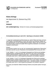 SCHLESWIG-HOLSTEINISCHER LANDTAG Drucksache 18/4289 18. Wahlperiode 2016-06-14 Kleine Anfrage des Abgeordneten Dr. Ekkehard Klug (FDP) und Antwort der Landesregierung – Minister für Inneres und Bundesangelegenheiten Kriminalitätsentwicklung im Jahr 2015 - Nachfrage zu Druckache 18/3996 1. Liegen der Landesregierung Erkenntnisse vor, welche Plätze die Kreise und kreis- freien Städte im Bundesvergleich mit allen 402 Kreisen und kreisfreien Städten bei der Häufigkeitszahl und der Aufklärungsquote belegen? Bitte für das Jahr 2015 nach Gewaltkriminalität, Straßenkriminalität, Wohnungseinbruchdiebstahl und Straftaten insgesamt aufschlüsseln. Antwort: Die Antworten ergeben sich aus den vier nachstehenden tabellarischen Übersichten. Die Daten stammen aus der Polizeilichen Kriminalstatistik(PKS) für das Jahr 2015. In den Tabellen 1.1 und 1.2 ist aufsteigend dargestellt eine Reihung der jeweiligen deliktsbezogenen Häufigkeitszahlen des Jahres 2015 der Kreise und kreisfreien Städte auf Bundesebene, aufgeschlüsselt nach 1. Gewaltkriminalität und Straßen- kriminalität sowie nach 2. Wohnungseinbruchdiebstahl und Straftaten insgesamt. In den Tabellen 1.3 und 1.4 ist absteigend dargestellt eine Reihung der jeweiligen deliktsbezogenen Aufklärungsquoten des Jahres 2015 in den Kreisen und kreisfreien Städten auf Bundesebene, aufgeschlüsselt nach 1. Gewaltkriminalität und Straßen- kriminalität sowie nach 2. Wohnungseinbruchdiebstahl und Straftaten insgesamt. Die Kreise und kreisfreien Städte Schleswig-Holsteins sind jeweils optisch hervorge- hoben.