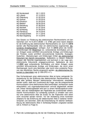 Drucksache 18/2055 Schleswig-Holsteinischer Landtag - 18. Wahlperiode AG Norderstedt 02.11.2015 AG Lübeck 01.12.2015 AG Oldenburg 01.02.2016 AG Itzehoe 01.03.2016 AG Elmshorn 01.04.2016 AG Meldorf 02.05.2016 AG Ratzeburg 01.06.2016 AG Reinbek 01.07.2016 AG Schleswig 01.09.2016 AG Flensburg 04.10.2016 AG Schwarzenbek 01.11.2016 AG Bad Segeberg 01.12.2016 Das Gesetz zur Förderung des elektronischen Rechtsverkehrs mit den Gerichten vom 16.10.2013 (BGBl. I, S. 3786) gibt einen klaren Zeitplan für die Eröffnung des elektronischen Rechtsverkehrs vor: Zum 1.1.2016 werden alle Rechtsanwälte über ein elektronisches sogenanntes „Be- sonderes Anwaltspostfach“ verfügen. Zum 1.1.2018 sehen die Verfah- rensordnungen die Möglichkeit vor, vorbereitende Schriftsätze und de- ren Anlagen sowie schriftlich einzureichende Anträge und Erklärungen der Parteien, sowie schriftlich einzureichende Auskünfte, Aussagen, Gutachten, Übersetzungen und Erklärungen Dritter als elektronisches Dokument bei Gericht einzureichen. Spätestens zu diesem Zeitpunkt müssen alle Gerichte organisatorisch und technisch in der Lage sein, elektronische Dokumente entgegenzunehmen. Spätestens ab dem 1.1.2022 sind vorbereitende Schriftsätze und deren Anlagen sowie schriftlich einzureichende Anträge und Erklärungen, die durch einen Rechtsanwalt, durch eine Behörden oder durch eine juristische Perso- nen des öffentlichen Rechts eingereicht werden, als elektronisches Do- kument zu übermitteln (vgl. § 130d ZPO n.F.). Das Vorhandensein einer elektronischen Akte ist keine zwingende Vo- raussetzung für die Eröffnung des elektronischen Rechtsverkehrs. So- bald aber größere Mengen elektronischer Informationen verarbeitet werden sollen, stellt sich zunehmend die Frage, wie die entsprechende Kommunikation ohne elektronische Akte komfortabel, rechtssicher sowie wirtschaftlich und organisationstechnisch sinnvoll abgewickelt werden soll. Dieser Handlungsbedarf wird sich zu einem Handlungsdruck entwi- ckeln, weil die Vollständigkeit der Papierakte bei zunehmender elektro- nischer Kommunikation nur aufwändig aufrecht zu erhalten sein wird. Auf eine elektronische Akte als Ersatz für die Papierakte wird daher nicht verzichtet werden können. Vor der Aufstellung eines konkreten Zeitplans für die Einführung der elektronischen Akte in weiteren Verfah- rensarten und Gerichten, steht die Entscheidung mit welcher Software- lösung die elektronische Akte in Schleswig-Holstein umgesetzt werden soll (s. Antwort zu Frage 2). 2. Plant die Landesregierung die bei der Erstellung/ Nutzung der erforderli- 2